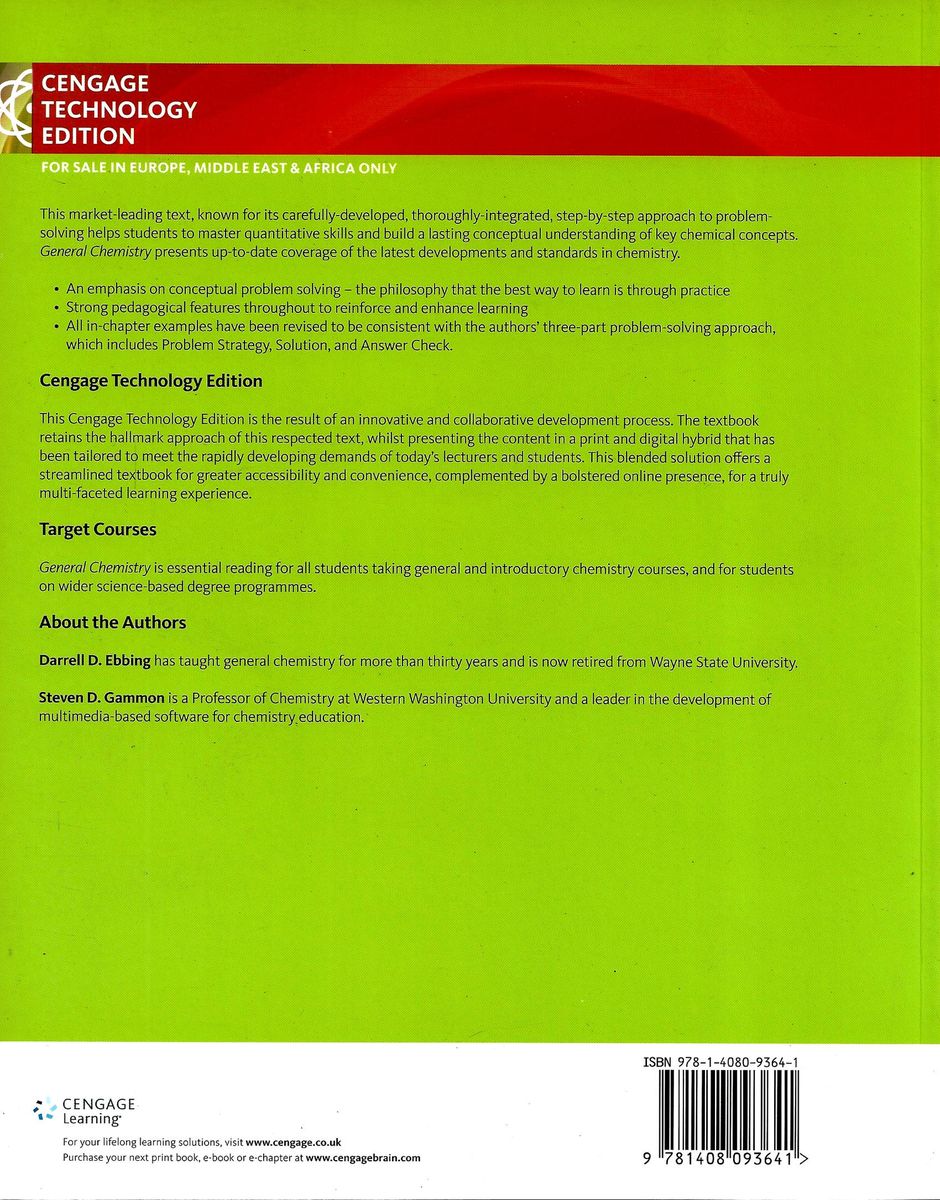 This Cengage Technology Edition is the result of an innovative and collaborative development process. The textbook retains the hallmark approach of this respected text, whilst presenting the content in a print and digital hybrid that has been tailored to meet the rapidly developing demands of today's lecturers and students. This blended solution offers a streamlined textbook for greater accessibility and convenience, complemented by a bolstered online presence, for a truly multi-faceted learning experience. This market-leading text, known for its carefully-developed, thoroughly-integrated, step-by-step approach to problem-solving helps students to master quantitative skills and build a lasting conceptual understanding of key chemical concepts. General Chemistry presents up-to-date coverage of the latest developments and standards in chemistry.