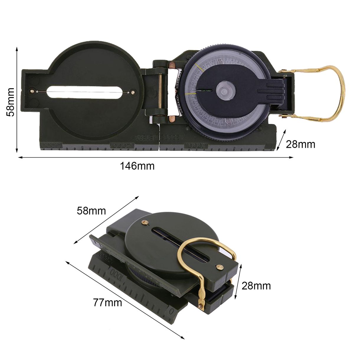 The length of the unfolding compass is 14.6cm, the width is 5.8cm and the height is 2.8cm while the length of the folding compass is 7.7cm, the width is 5.8cm and the height is 2.8cm.