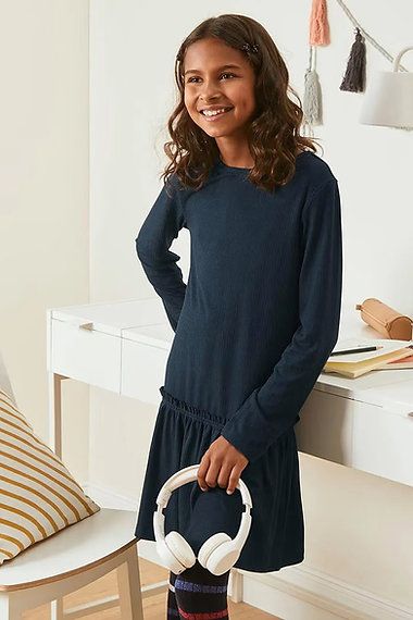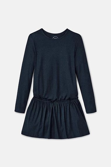 1 x Girl Long Sleeve Textured Dress, Navy Blue