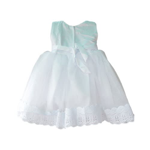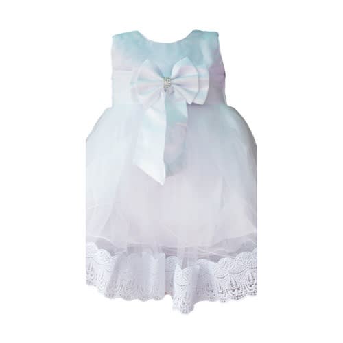 Sleeveless special occasion dress with lacy suplice bodice, ribbon bow waistband, and layered illusion skirt
