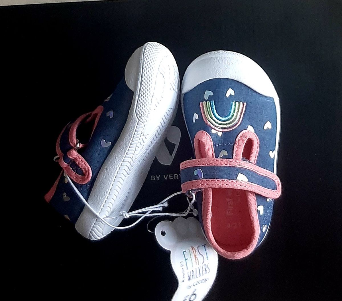 Girls first walkers shoe for your little princess. It features cut out silver heart pasties, rainbow embroidery badge, T-bar design, rubber moulded and gripped outer sole.
