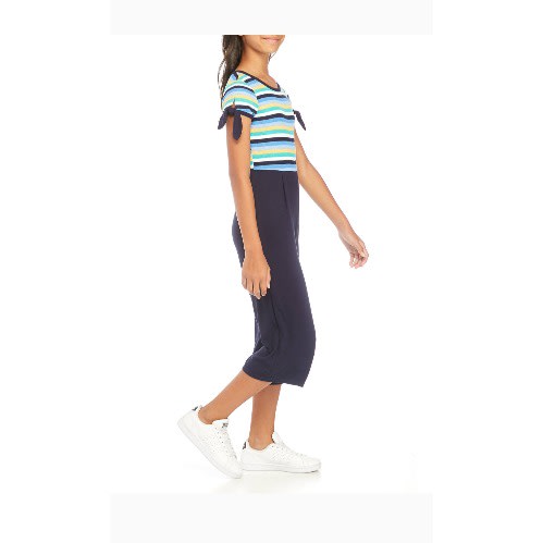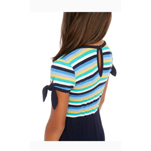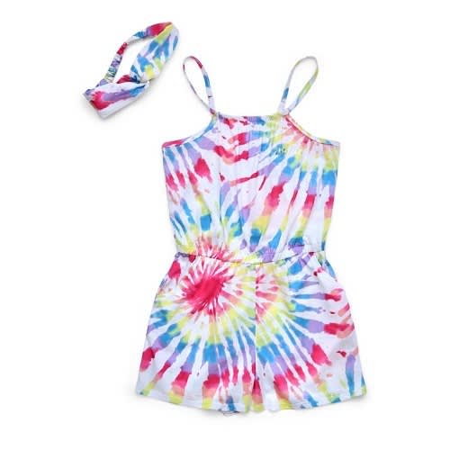 Perfect for lounging and slaying , this colorful romper from Justice is a perfect addition for the summer! She will love the vibrant, multicolor tie dye prints and the adorable coordinating headband. The romper features a high neckline, thin straps, and elastic waistband. The pull on styling of the romper make changing easy when it is time to get ready for school or camp. She will be the star of any sleepover!