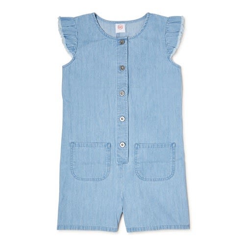 Bring out her sophisticated summer style with this Wonder Nation Girls & rsquo; Ruffle Sleeve Romper. Along with two front patch pockets for all her essentials, the fashionable front button placket and flutter sleeves create an elegant look to pair with her favorite sneakers or sandals for endless adorable combinations. Exclusively at Walmart.