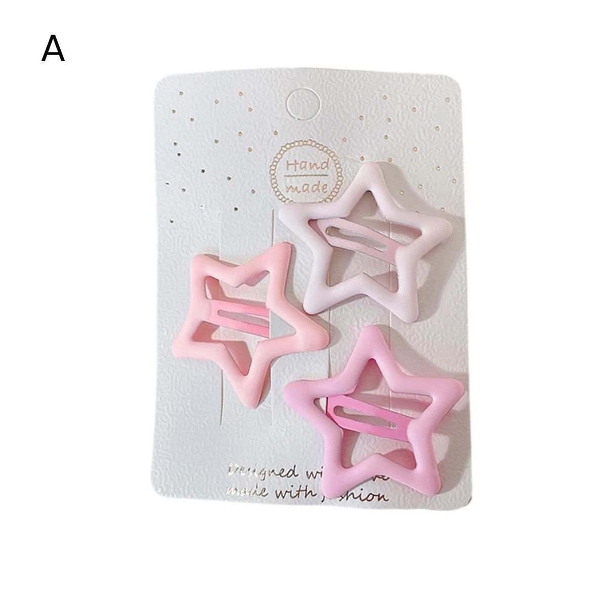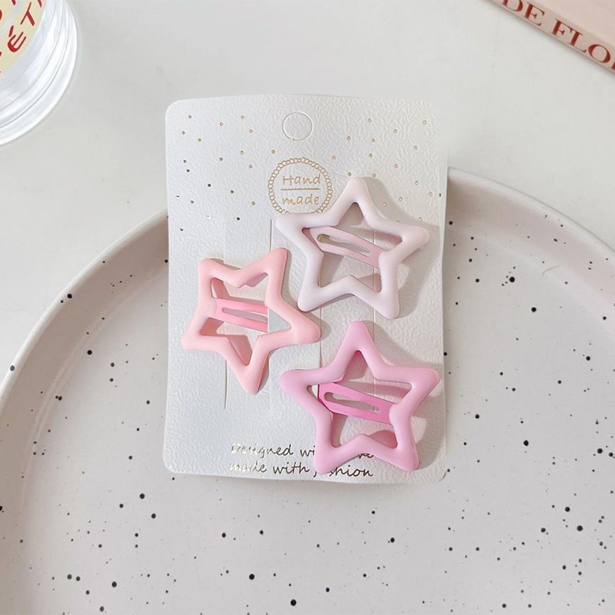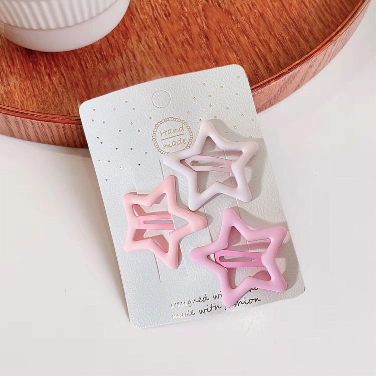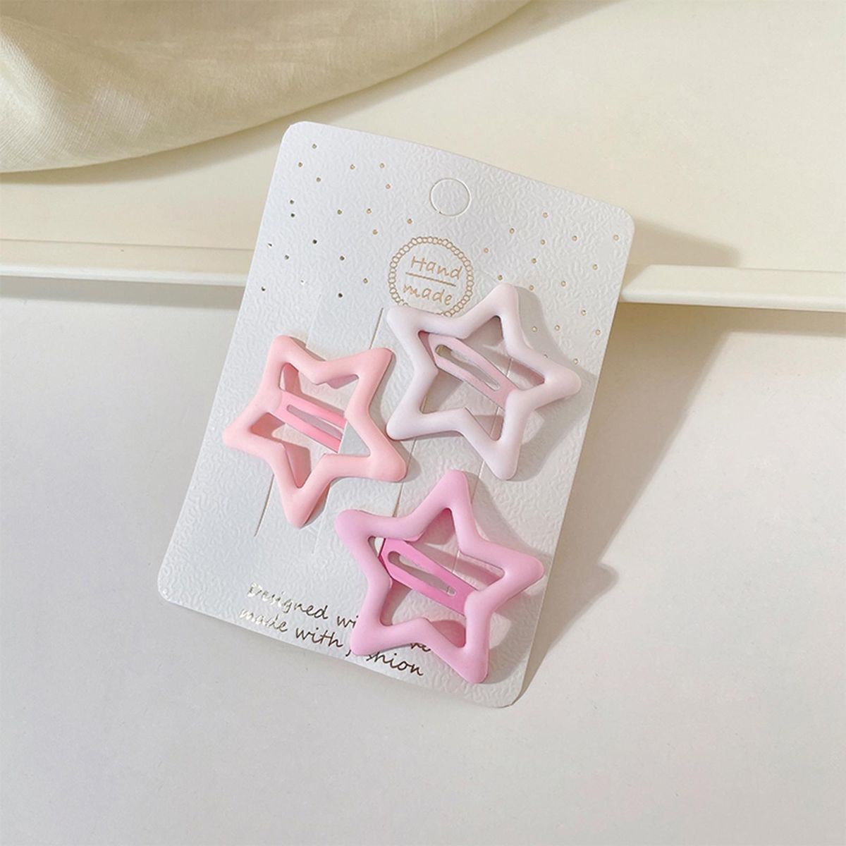Our pink geometric hair clip collection! this exquisite set features a variety of cute and stylish shapes such as hearts, bows, and five-pointed stars. each cardboard contains 2 or 3 clips, making it perfect for mixing and matching to create unique hairstyles.