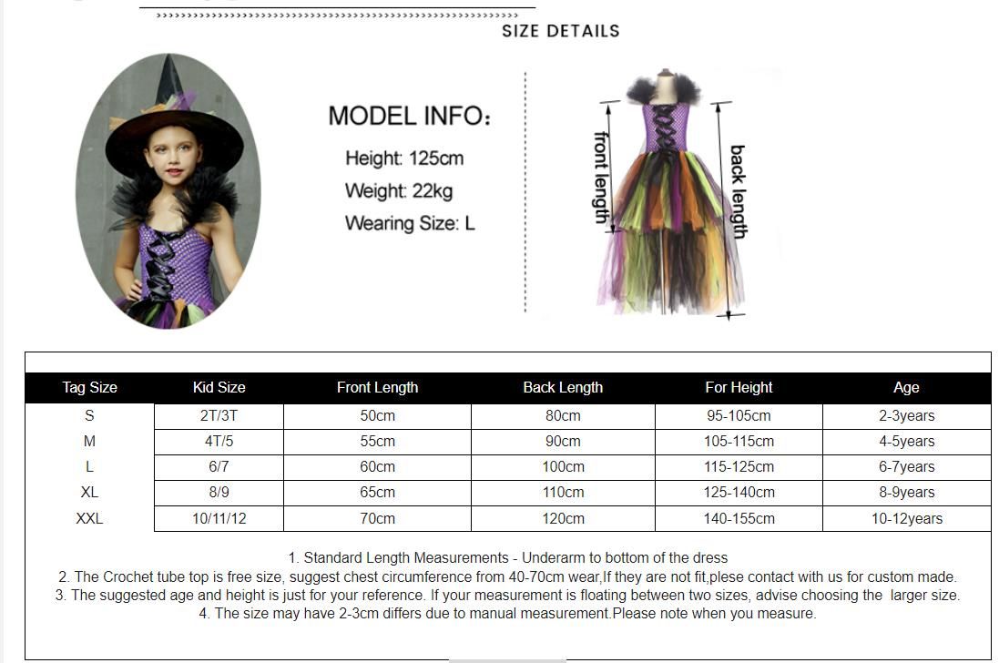 Features1. Children Halloween Witch Tutu Dress with Flower Witch Hat, High Low Design.2. The Trailing tutu Dress is made from a purple UNLINED crochet top with 4 colors Nylon tulle that's hand tied onto bodice.3. Shoulder straps are embellished with Black tulle making the dress perfect stereo effect.4. Witch Hat Size: 38cm*36cm5. Dress is for Halloween, Cosplay, Carnival Party, Pageant, photo...6. for a perfect fit, please measure around the broadest part of your child's chest.