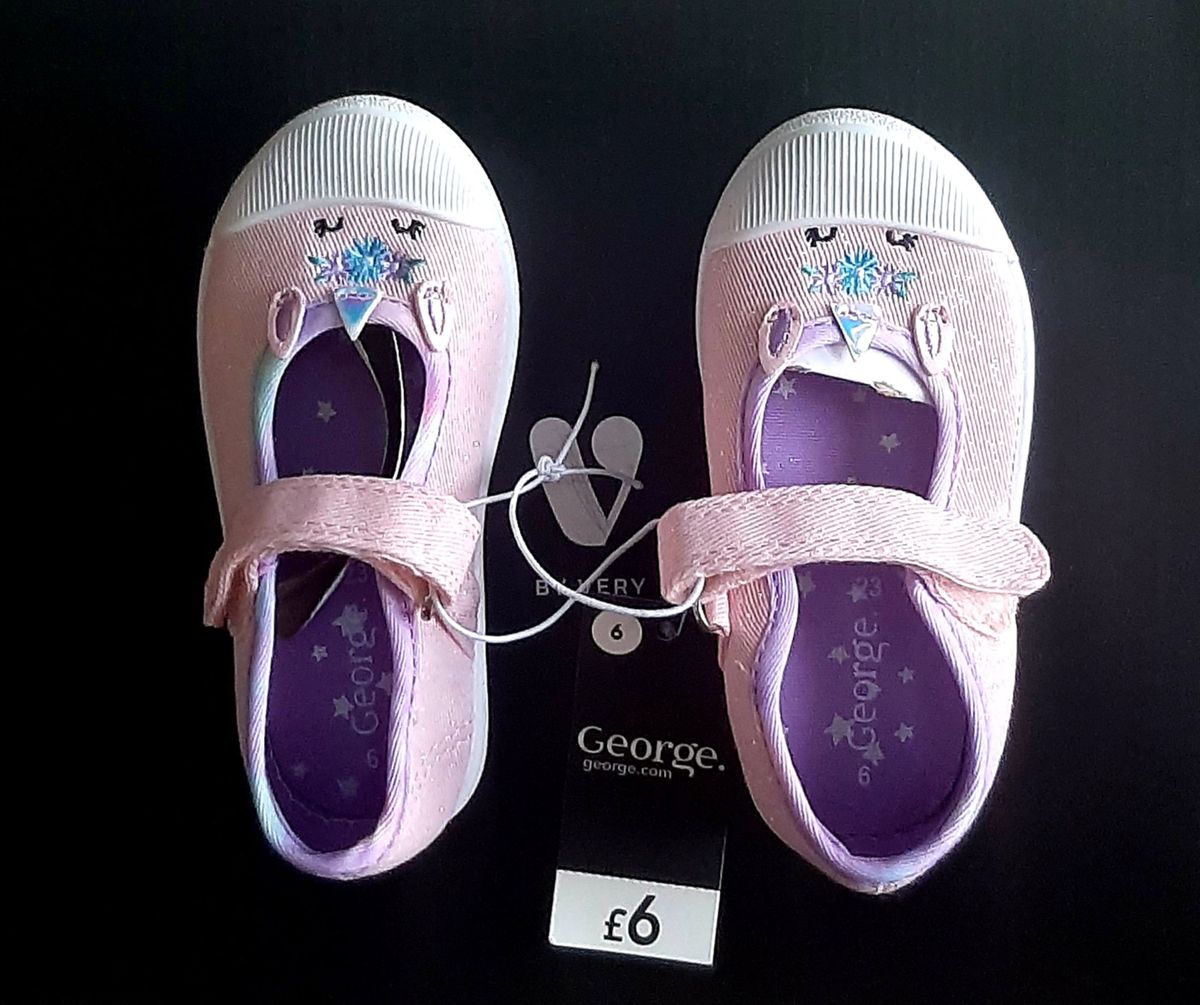 George. These trainers comes in a T-Bar design, canvas body, cat ear details, all over body shimmer, padded insole and gripped sole