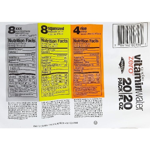 vitaminwater zero xxx: reverse osmosis water, erythritol, less than 0.5% of: vitamins A, C, B3, B5, B6, B12 (beta-carotene, ascorbic acid, niacinamide, calcium pantothenate, pyridoxine hydrochloride, cyanocobalamin), electrolytes (calcium and magnesium lactates and potassium phosphate), sodium selenate, manganese citrate, citric acid, gum acacia, fruit and vegetable juices (for color), natural flavors, stevia leaf extract. vitaminwater zero sugar squeezed: reverse osmosis water, erythritol, less than 0.5% of: vitamins A, C, E, B3, B5, B6, B7 (retinyl palmitate, ascorbic acid, alpha-tocopheryl acetate, niacinamide, calcium pantothenate, pyridoxine hydrochloride, biotin), electrolytes (calcium and magnesium lactates, calcium and potassium phosphates), zinc gluconate, sodium selenate, citric acid, phosphoric acid, gum acacia, glycerol ester of rosin, natural flavors, stevia leaf extract. vitaminwater zero sugar rise: reverse osmosis water, erythritol, less than 0.5% of: vitamins A, C, E, B3, B5, B6, and B12 (beta-carotene, ascorbic acid, alpha-tocopheryl acetate, niacinamide, calcium pantothenate, pyridoxine hydrochloride, and cyanocobalamin), electrolytes (calcium and potassium phosphates and calcium and magnesium lactates), zinc gluconate, citric acid, gum acacia, phosphoric acid, sorbitol, glycerol ester of rosin, natural flavors, beta carotene (for color), stevia leaf extract.
