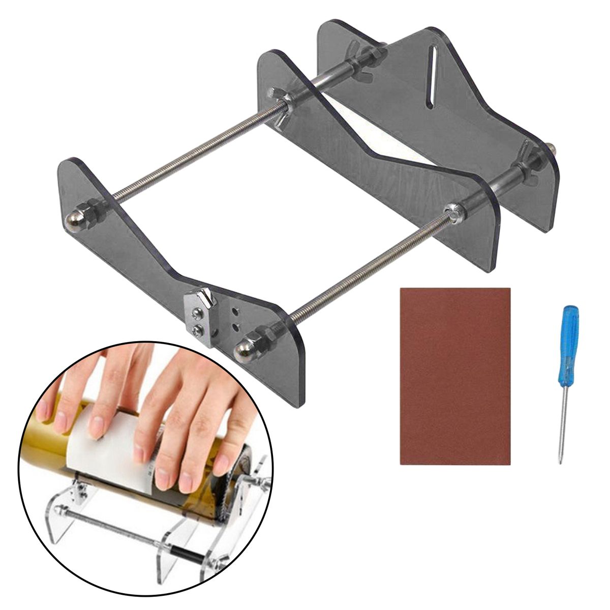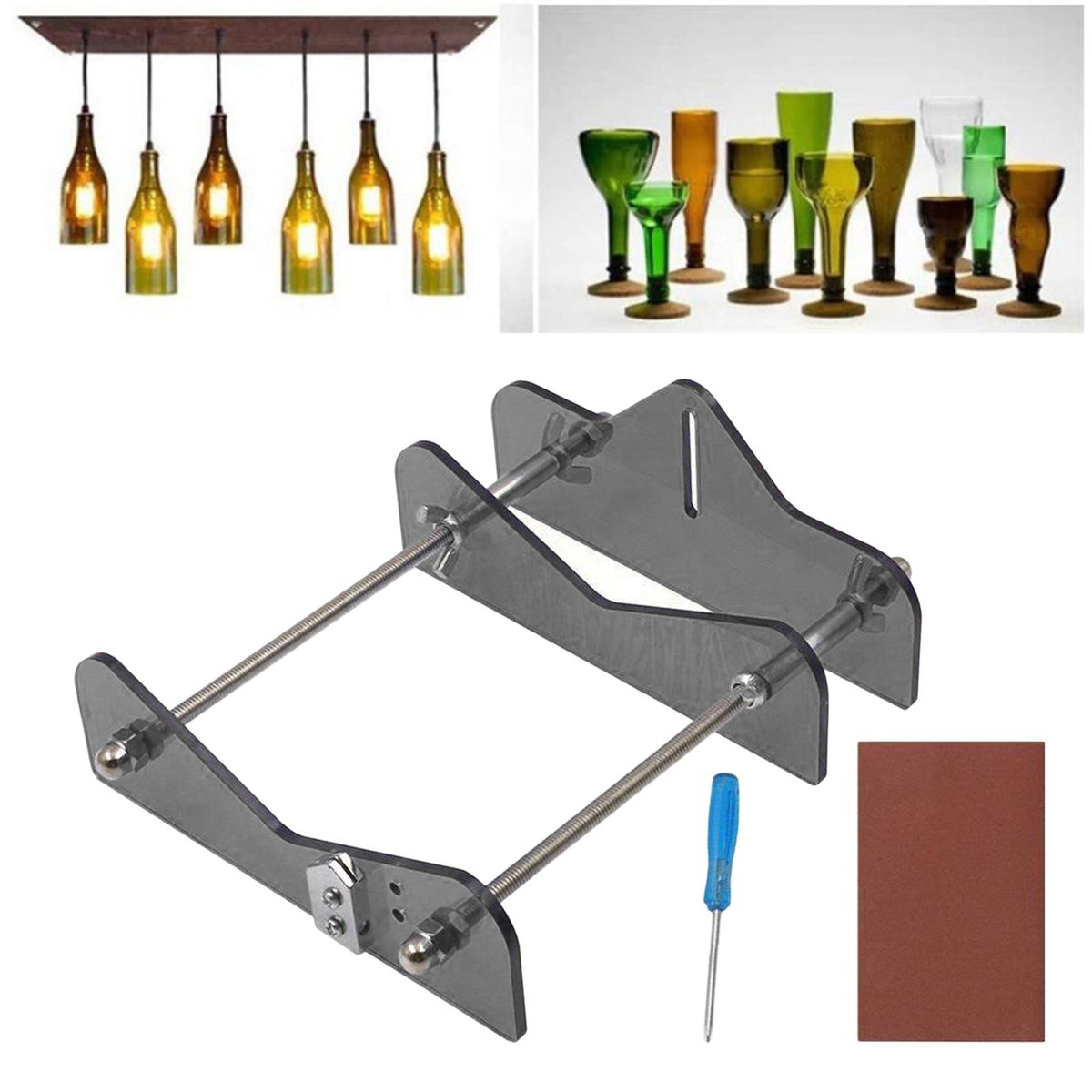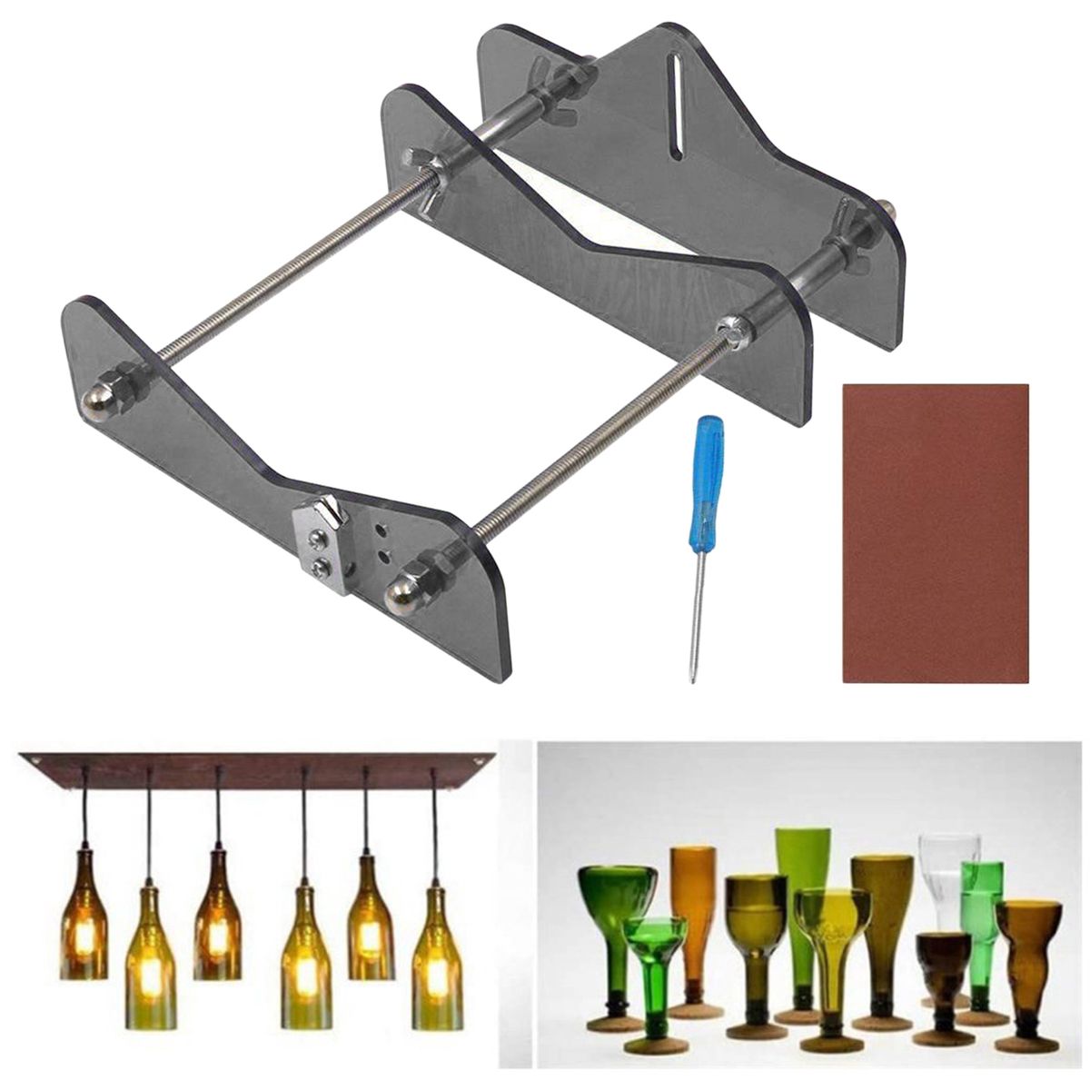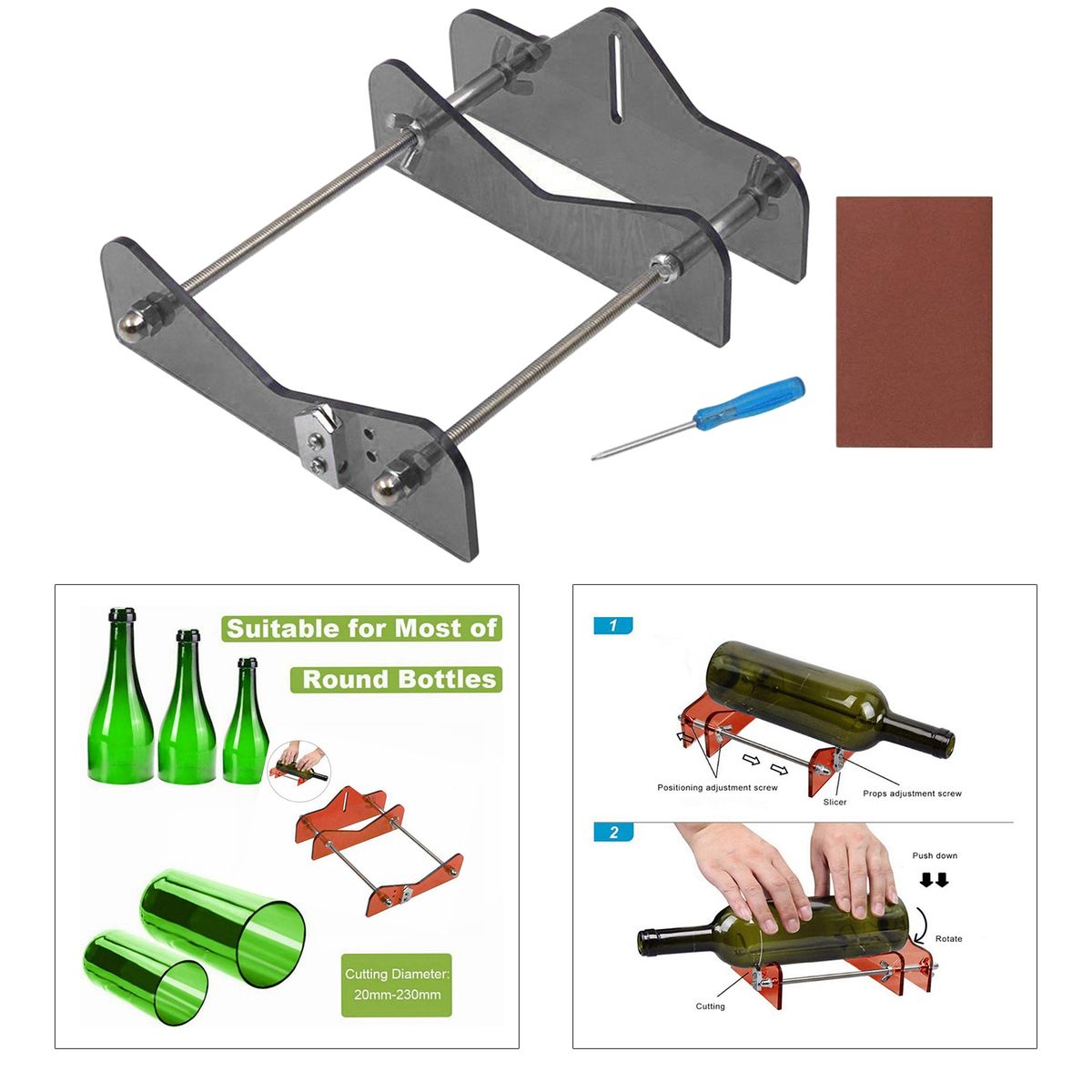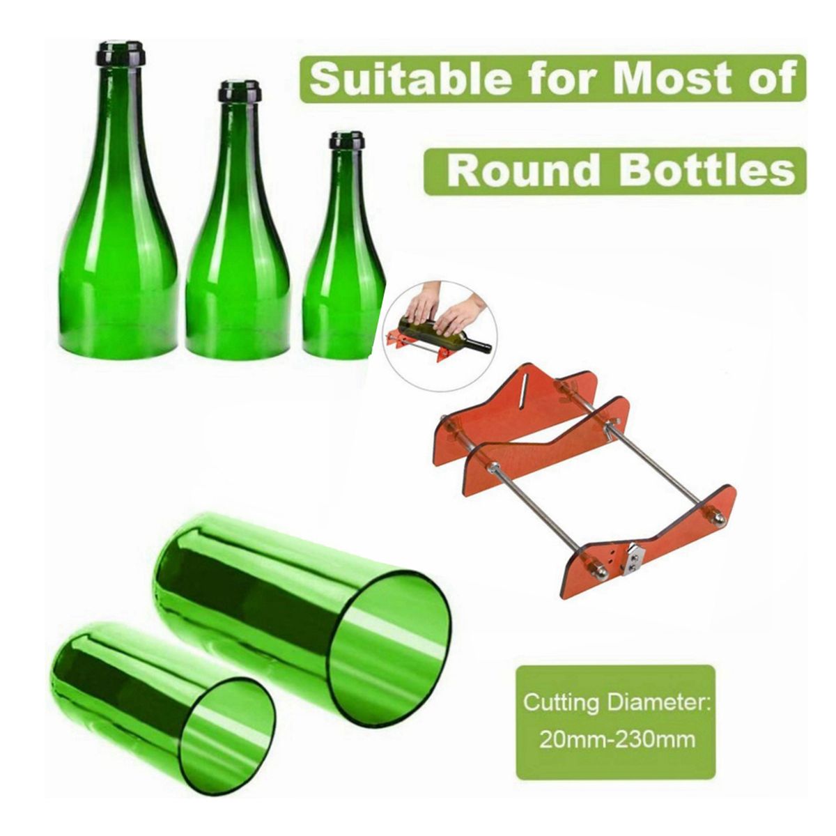 Suitable for most of /wine/drinking glass round bottles (vodka, tapered, champagne, , perrier, pellegrino, patron, growler, grand marnier, firestone and so on). Diameter: Approx. 20mm - 230mm / 0.79 - 9.06inchHighly and light durable, easy to use, simply place your bottle on the device, apply constant moderate pressure, and rotate; heat the score over boiled water and cold water alternately bathe three times, more sturdy light acrylic with metal material.Meet all your creative recycling ideas and handmade practice,decorate your own beautiful life, help you do your some of the environment protections.Material: Acrylic and Metal,Size: Approx.200x150mm/7.87x5.91inch