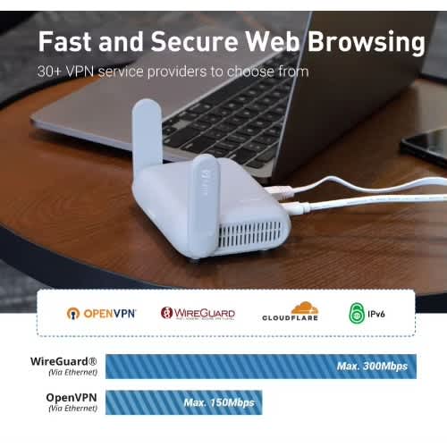 OPENVPN AND WIREGUARD ARE PRE-INSTALLED, COMPATIBLE WITH 30+ VPN SERVICE PROVIDERS. SIMPLY LOG IN TO YOUR EXISTING VPN ACCOUNT, AND BERYL AX AUTOMATICALLY ENCRYPTS ALL NETWORK TRAFFIC WITHIN THE CONNECTED NETWORK. MAX. VPN SPEED OF 150 MBPS (OPENVPN); 300 MBPS (WIREGUARD)