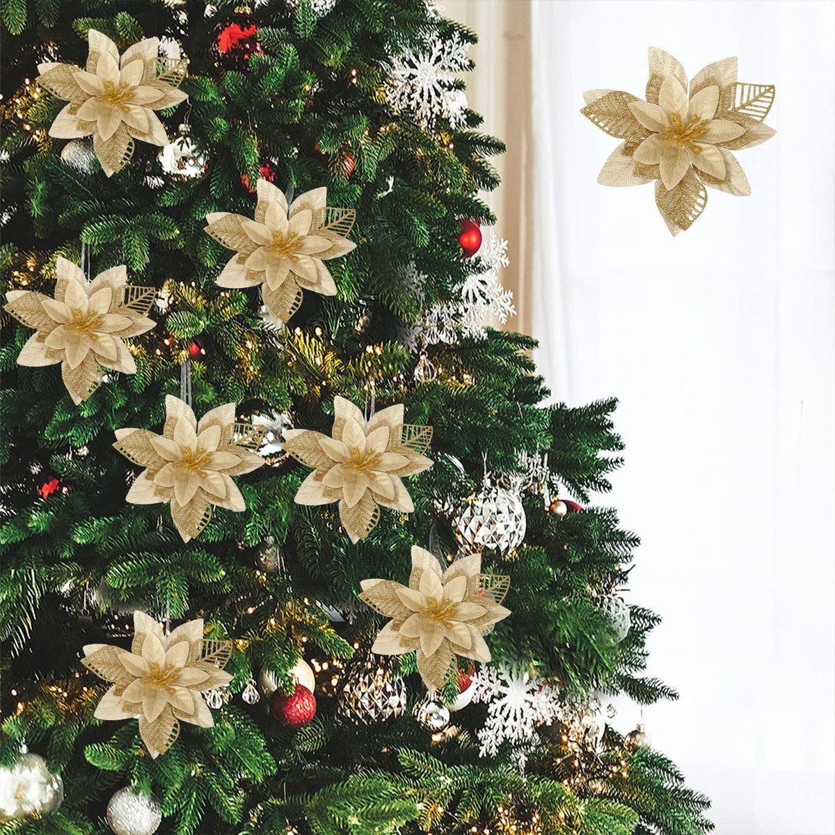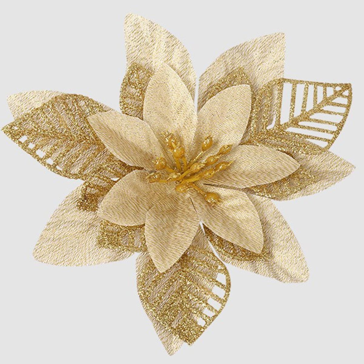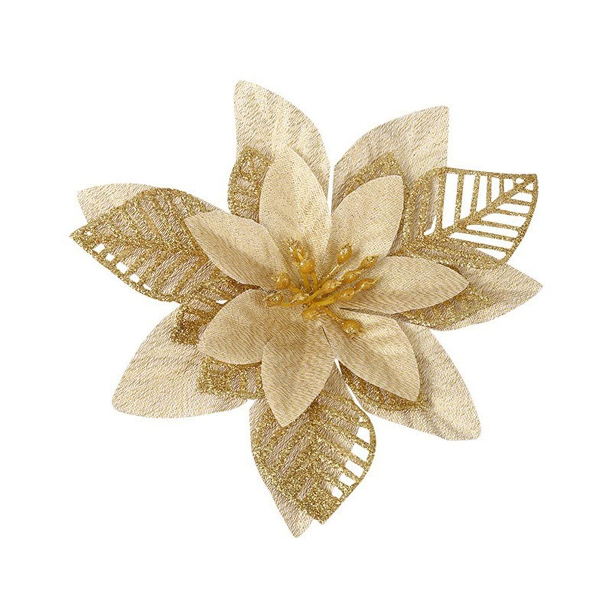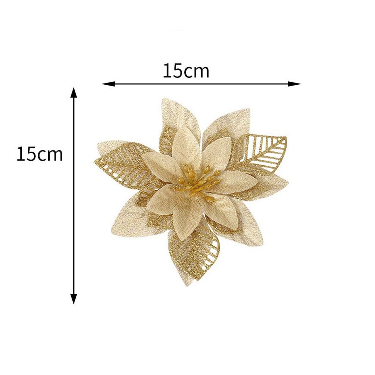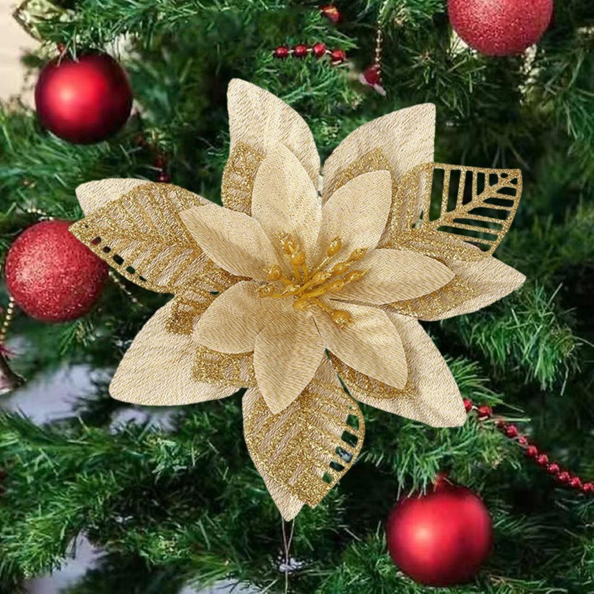 Add a touch of elegance to your holiday decor with these christmas ornament gold dust flowers. made of high-quality plastic and finished with glitter, these flowers come in a hollowed-out design in gold, silver, and red. they can be used to decorate wreaths, canes, gifts, crafts, mantles, christmas trees, flower arrangements, windows, and more. these versatile flowers are perfect for any festive occasion or to make your home feel merry and bright. you can even use them to decorate christmas gift wrap and wreaths for an extra special touch. please note that there may be a slight odor when opening the package due to the manufacturing process, but simply let them air dry for 1-2 days and the smell will dissipate. don't miss out on these must-have christmas decorations!