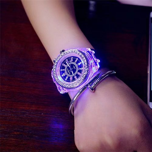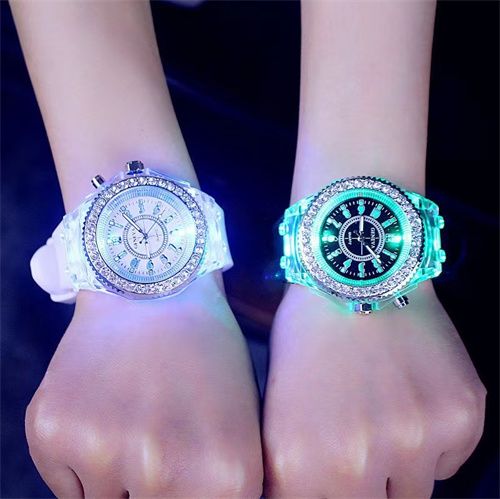There is a button on the right side ofthe watch, and when you press the button, the watch will send out coloredlights.Quantity: 1Item Type: LED WatchesGender: FemaleStyle: FashionMovement: QuartzBand Material: SiliconeCase Shape: RoundMovement:Display: Analoglength: 24cm/9.4"(approx)BeltWidth:2cm/0.78"(approx)Fashionable Simple wristwatch that is made to show your style. Fits for all occasions, corporate and casual. Matches your outfit of choice.Nice gift for your friend, lover or family.Such Wrist Watch looks stylishThe Bracelet Watch is manufactured with exquisite high finishingPackage.