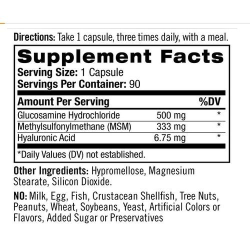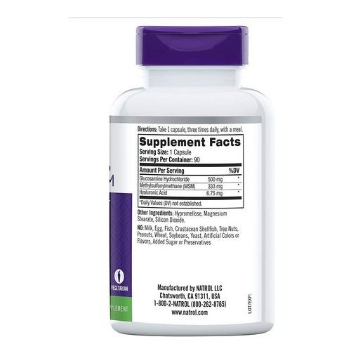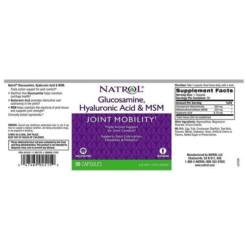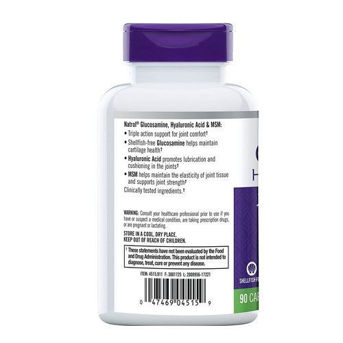 Natrol Vegetable Hyaluronic Acid/MSM/Glucosamine supports joint flexibility and comfort. It is a triple-action joint formula. Natrol's potent combination of Hyaluronic Acid, MSM, and Glucosamine helps maintain joint flexibility and comfort, while promoting healthy connective tissue. Hyaluronic Acid is a component of synovial fluid found in the joints of the body. MSM is a compound that strengthens collagen. Glucosamine is a compound found naturally in the body that is used in the formation and repair of cartilage and other body tissues. By combining all 3 of these powerful ingredients together, you get the benefit of joint flexibility, strengthening, comfort and repair. Natrol makes this product in the U.S.A.!