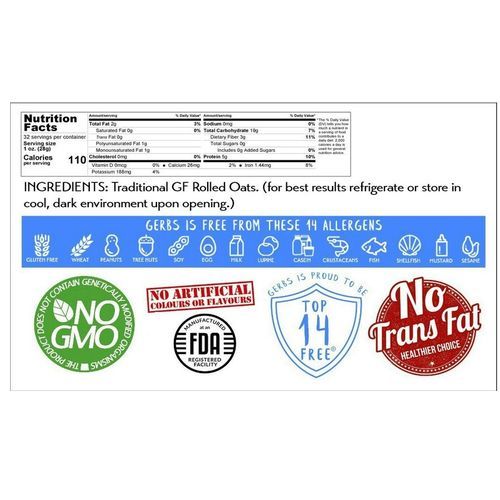 Gerbs Rolled Oats Packaged on dedicated Allergen Free equipment in Rhode Island by our Specialy trained staff. Product of Gluten Free Harvest - Packaged by GERBS.