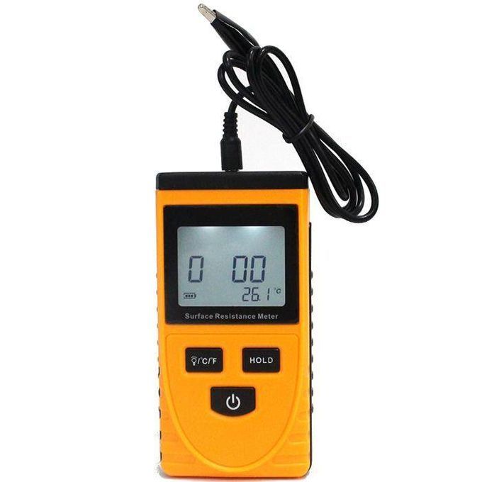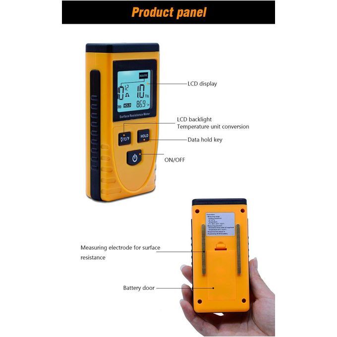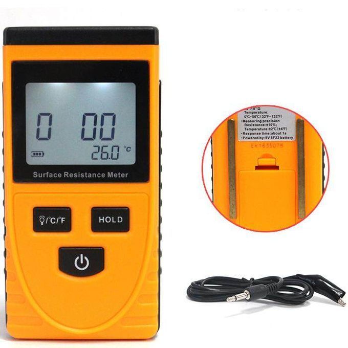 Surface resistance . Three modes to display resistance value on object surface or material property simultaneously. Ambient . Temperature unit conversion between /F. Data hold function. LCD back light for easier and clear reading. Specifications: