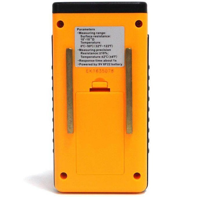 Measuring Range of Resistance:103- 1010Ohm Accuracy: (+/-10)% Response Time of Resistance Measurement: 1s Measuring Range of Temperature:0-50C / 32-122F Accuracy: (+/-)2C; (+/-)3.6F Supply: 9V 6F22 (NOT included) Product Size: 12.5 x 6.3 x 3cm / 4.92 x 2.48 x 1.18in Product Weight: 121g / 4.27oz Package Size: 20.5 x 15 x 7cm / 8.07 x 5.9 x 2.75in Package Weight: 187g / 6.62oz Package Included:
