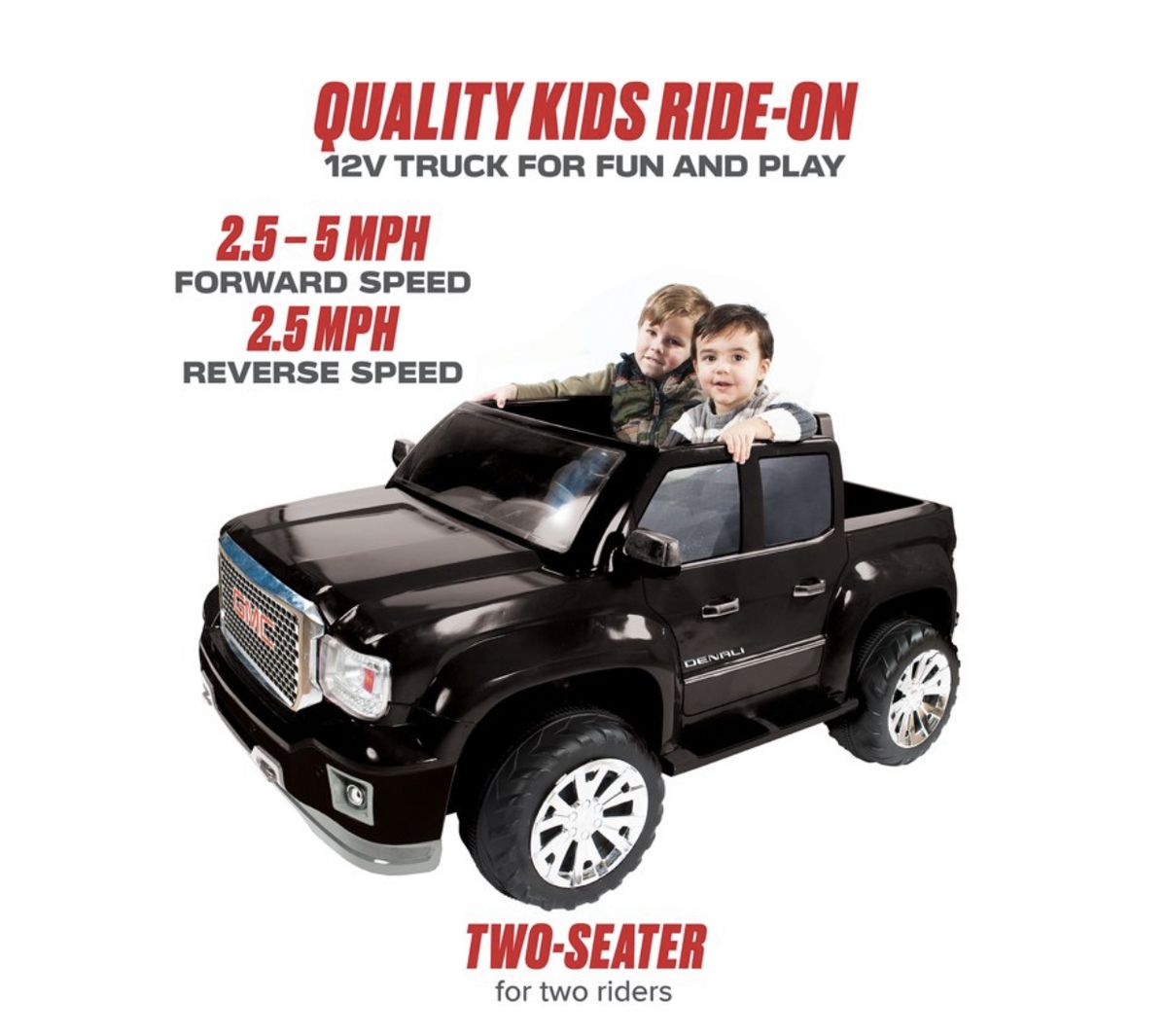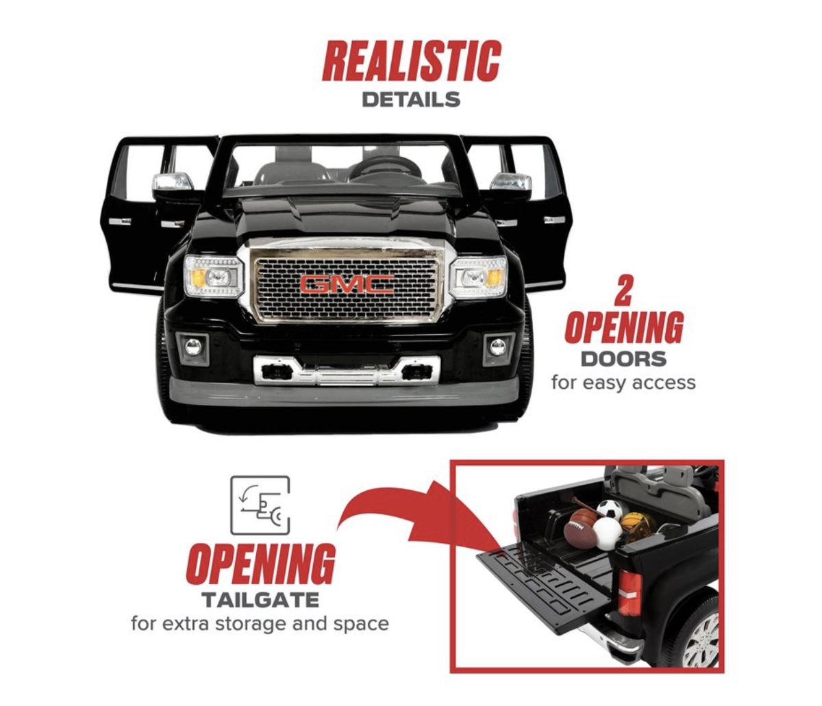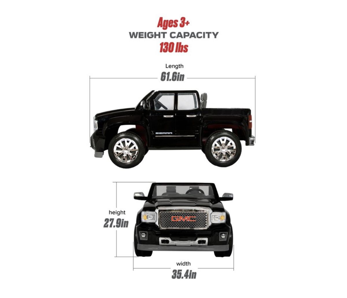 The Rollplay GMC Denali 12-Volt Battery-Powered Ride-On was created with kids in mind: the vehicles wide design ensures a consistent stable ride and provides two working doors to keep your children safely inside. The seating area has plenty of space for sure footing, while the easy to turn and swivel steering wheel makes the Rollplay GMC Sierra Denali 12-Volt Ride-On easy for little hands to maneuver and avoid those tricky driving obstacles. The large wheels and body boasts full life-like design inside as well - which includes cup holders, a clear windshield, a detailed dashboard, and real mirrors that fold. Sculpted from heavy-duty plastic, the trucks frame is sure to stay free of rust and is guaranteed with a 1 year warranty that parents know they can count on. The 12-Volt battery, with a 6-month warranty, includes a battery life indicator, so you'll know when it's time for a pit stop. With a maximum weight limit of 130 lbs. total, this truck is recommended for children 3+ years of age. Minimal assembly is required before use. 2 AA batteries required for steering wheel sounds, not included.