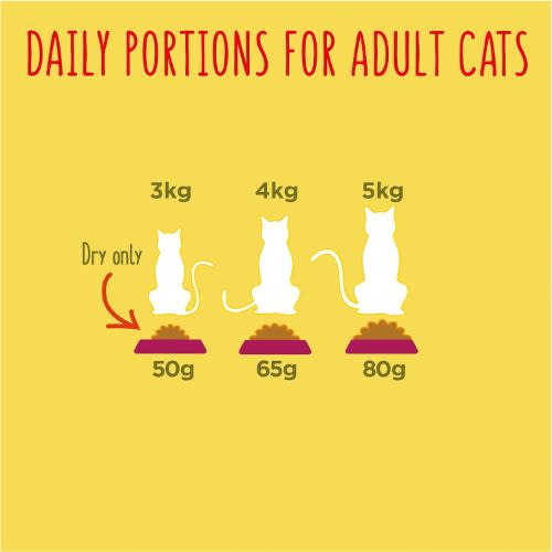 Go-Cat Complete for Adult Cats is a 100% complete meal for cats aged 1-6 years. These guidelines are based on moderately active cats. Individual needs vary and feeding should be adjusted as required. Fresh, clean water should always be available.