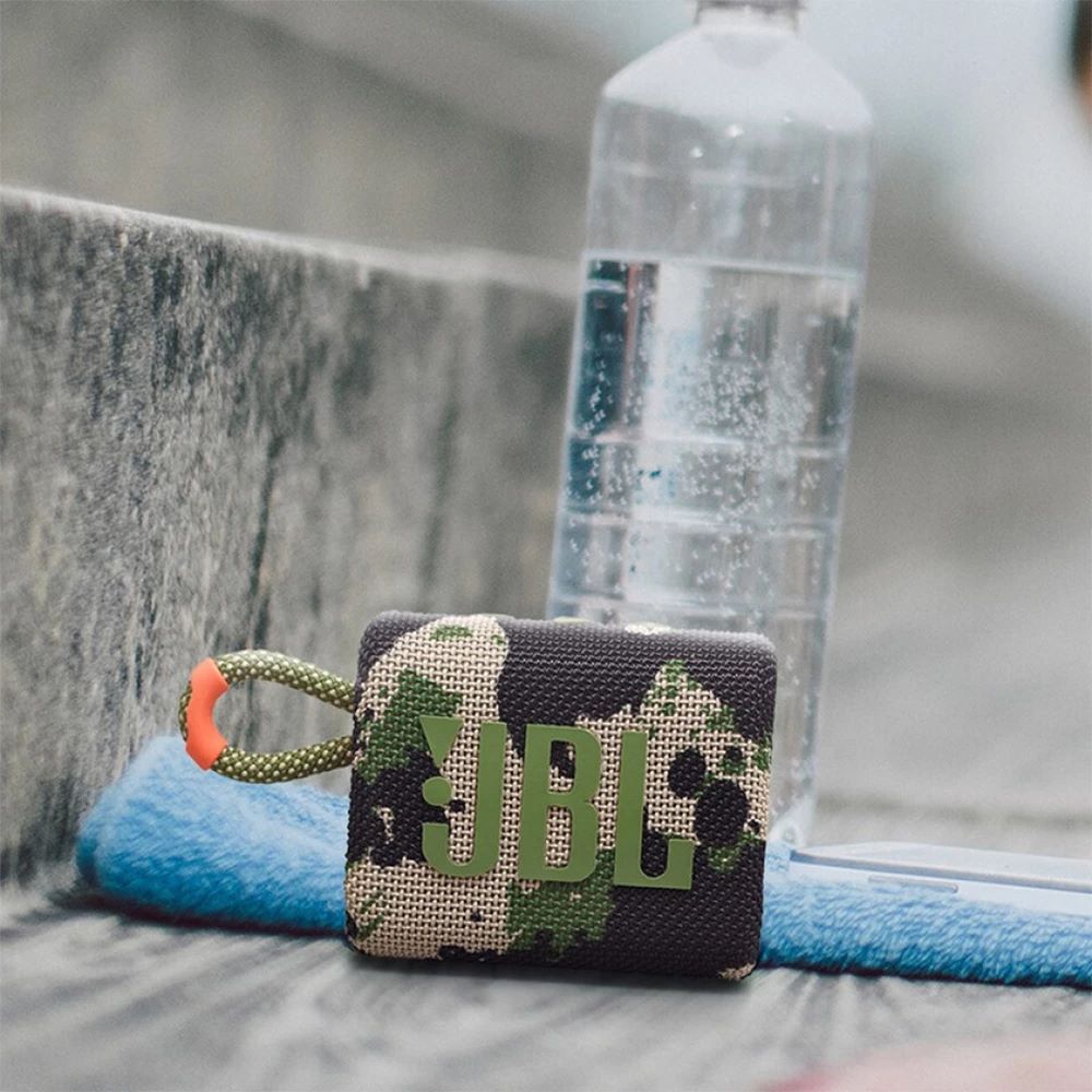 - A la piscina. Al parque. JBL Go 3 es resistente al agua y al polvo IP67, por lo que puede llevar su altavoz a cualquier lugar.