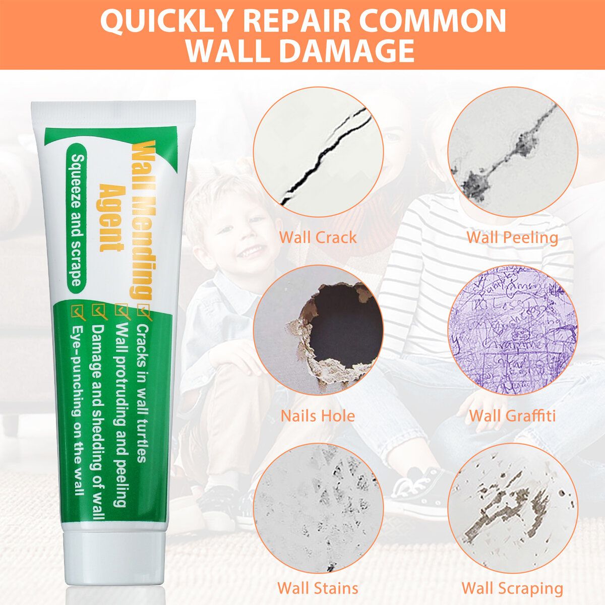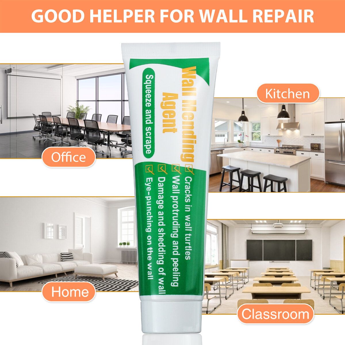 Wall mending agent is one of the essential repair tools for the family. Just open the cover, then smoothly squeeze and scrape it on the wall to make a quick-drying patch. Repair traces are almost invisible, simple and fast to solve the wall damage problem for you.