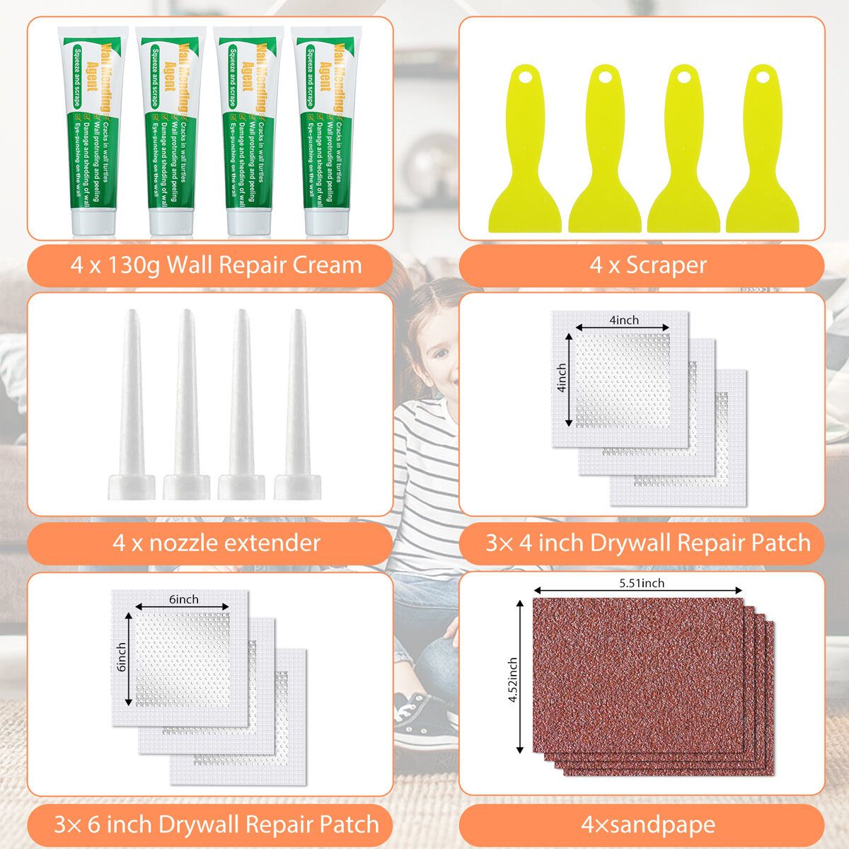 BSHAPPLUS drywall repair kit includes 4 * 100g wall repair cream, 4 * scraper, 4 * nozzle extender, 4* sandpapers, 6*wall hole repair patch. Spackle wall mending cream can be used on most damaged walls.