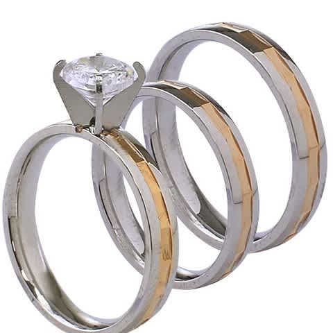Complete steel wedding ring set. its stone diamond. it 100 percent steel. stron and reliable. make your day so graciouse by using thise silver and gold set