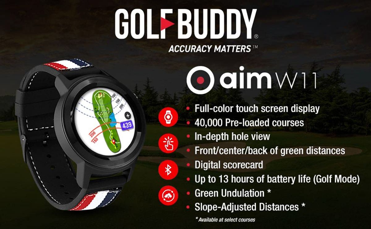 The aim W11 GPS Golf Watch provides accurate distance measurements, with a 1.3” TFT-LCD color touch screen that provides distance calculations to the front, center, and back of the green, and distances to targets and hazards. The watch automatically recognizes which hole you are playing and has manual pin placement, a digital scorecard, and a rechargeable lithium-ion battery which lasts up to 13 hours in golf mode.