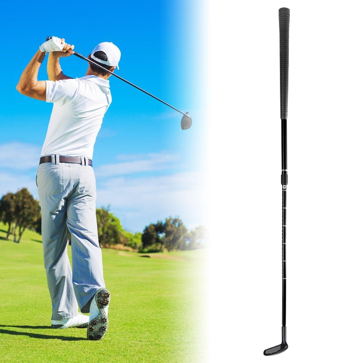【Golf Telescopic Chipper】: Golf chipper is retractable and adjustable, both adults and children can use it.【Dual Sided Chipper】: Golf Wedge is designed for both right and left handed golfers. Great gift for someone who loves to play golf.【Quality Material】: Chipping golf club is made of high quality zinc alloy material, durable and resistant to hit.【With Scale】: The golf chipper club is designed with a scale line, letting you adjust the length at will.【Comfortable Grip】Golf chipping practice club with rubber nonslip grip, comfortable and breathable.