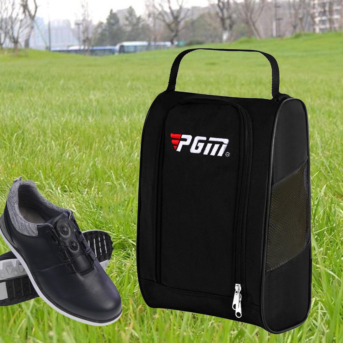 Made of 4200 nylon cloth, waterproof, durable, tear and wear resistant.The capacity is up to 10 litres, which can accommodate most different shoe sizes.The mesh cloth is located on both sides of the storage bags to ensure their air permeability.This golf shoe bag helps to keep your shoes dust free and protect shoes from stains. Ventilation eyelet keeps your footwear fresh.Multipurpose shoe bag protects most shoe sizes and types including football, golf, rugby, hiking, soccer, gym, cycling, tennis, bowling, dance, ballroom, pointe and more.