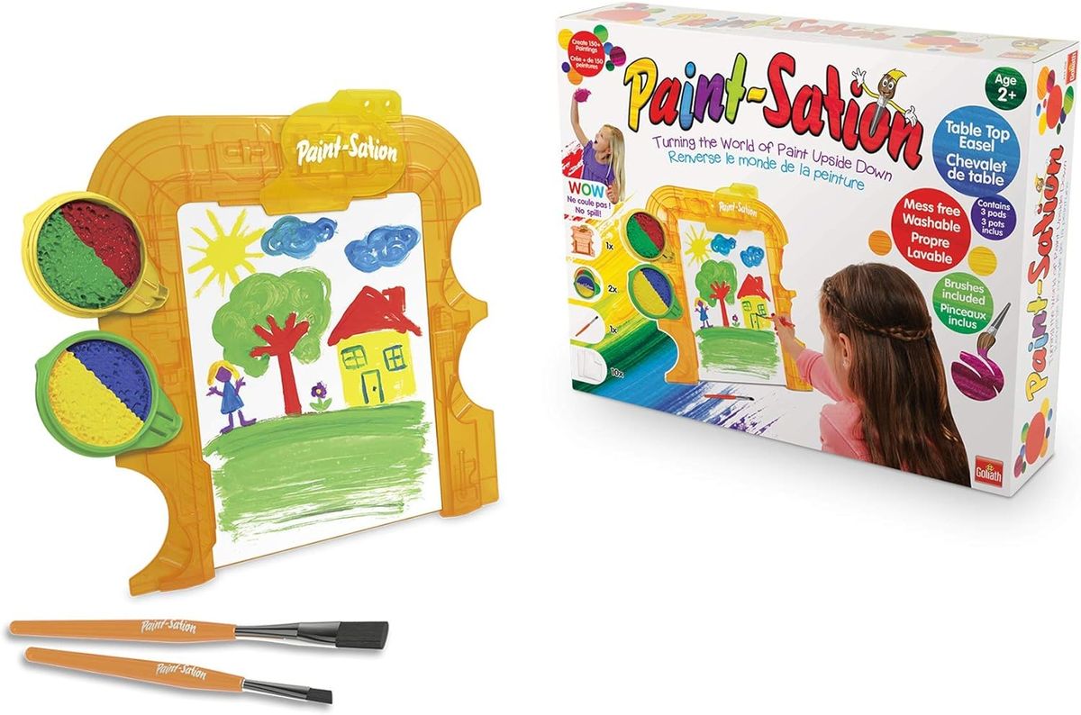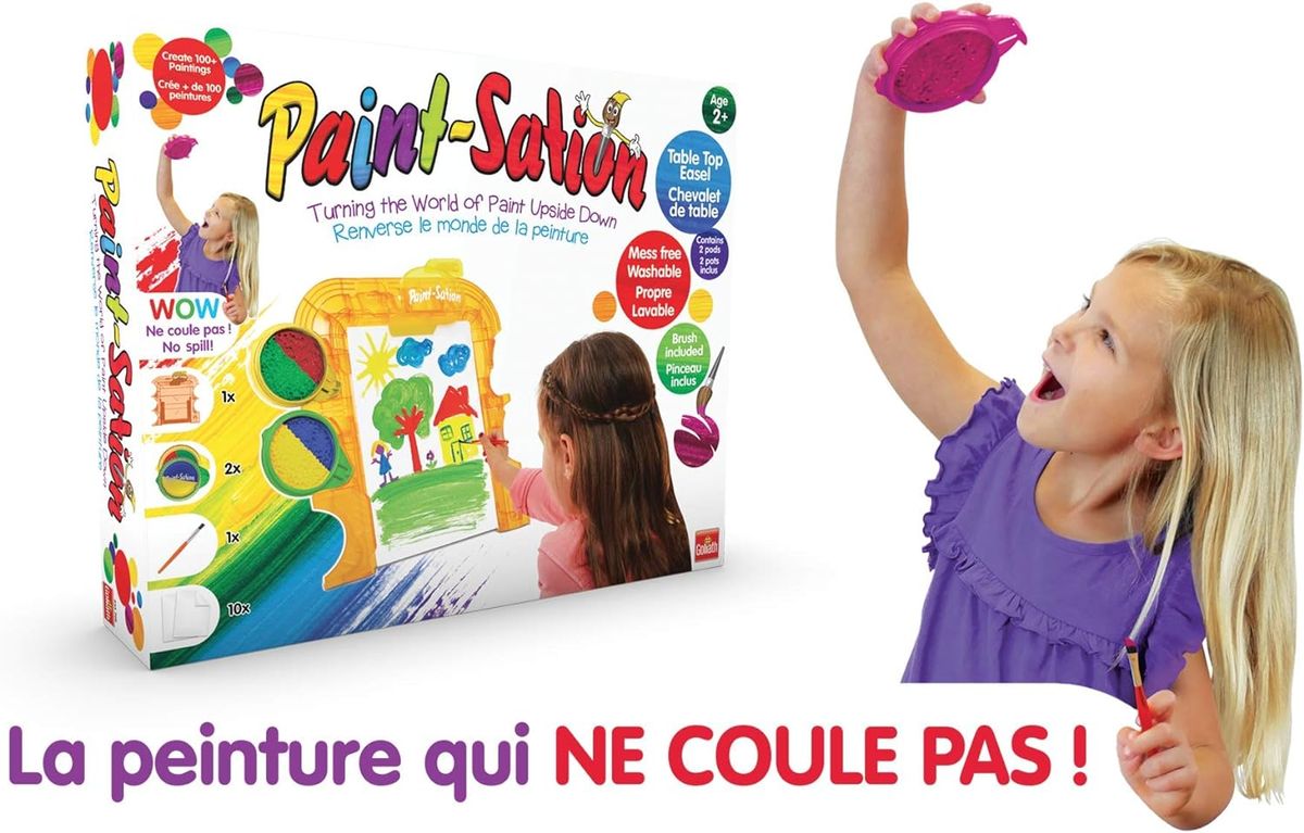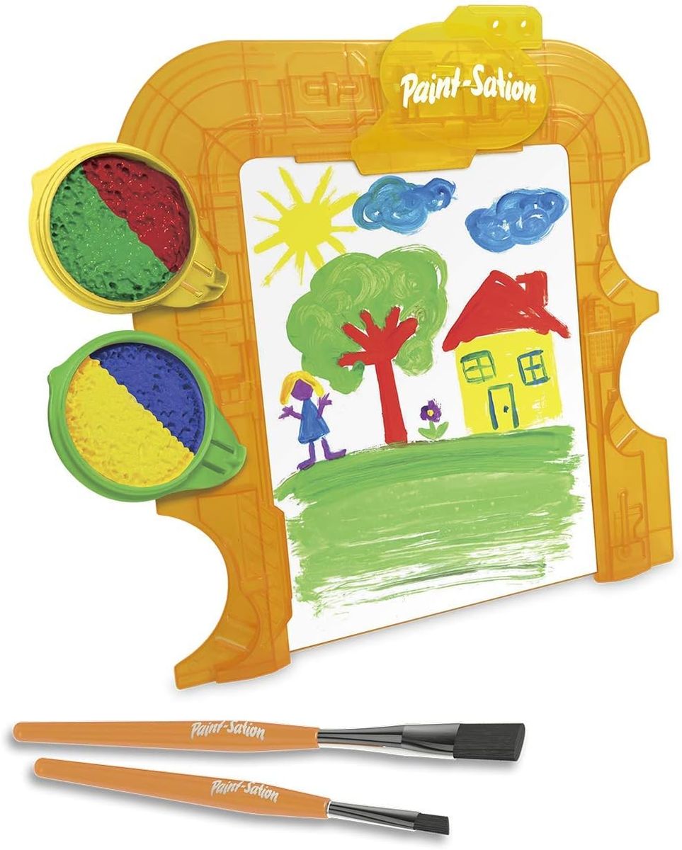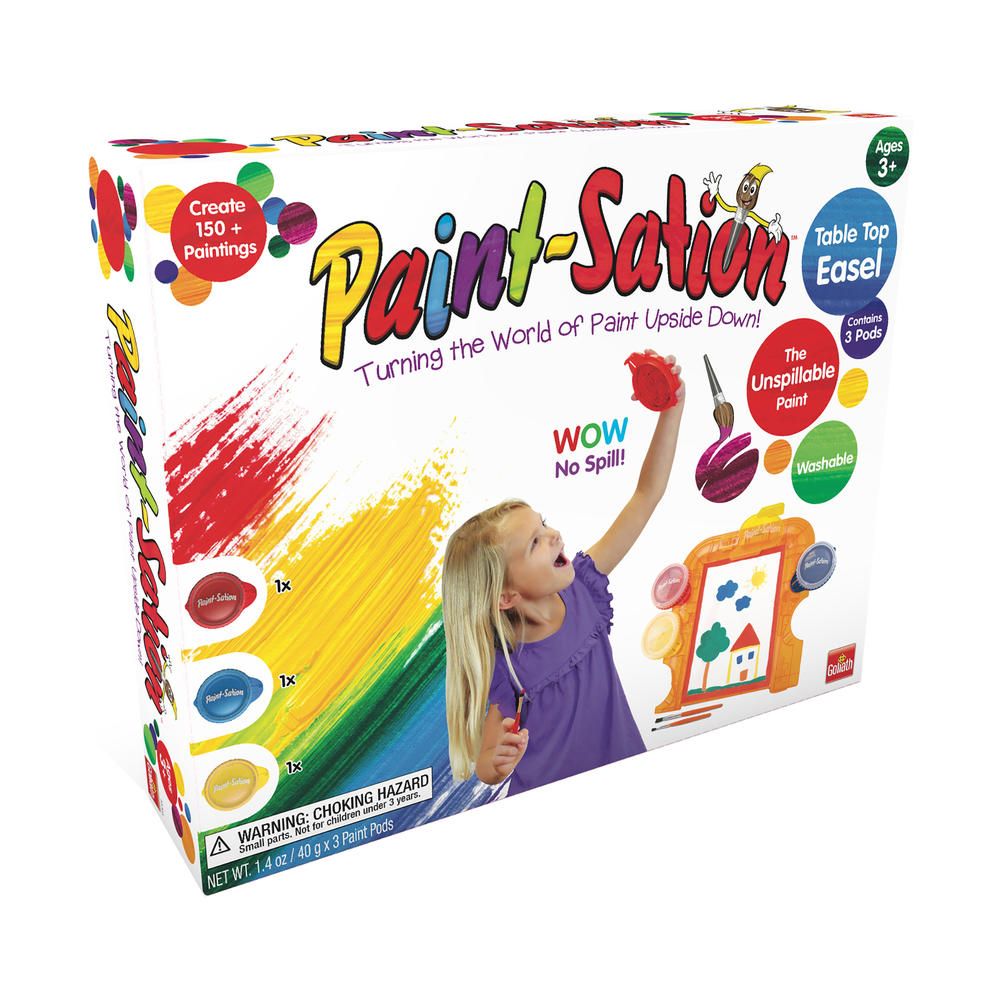 Contents include: 3 Paint Pods, 1 Easel, 2 Paint Brushes, 10 Paper SheetsFor 1-2 playersAges 3 and upGet ready to create anywhere with the Paint-Sation Table Top Easel Set! Complete with 3 brightly colored self-contained paint pods with 1.4 ounces of paint each, the unique easel holds the pods for hands-free fun! Simply touch your brush along the specially-designed bristles, and you're ready to paint. Even if you turn the pod upside-down, the paint won't drip out! Moms and kids will agree - this paint is Paintsation-al!