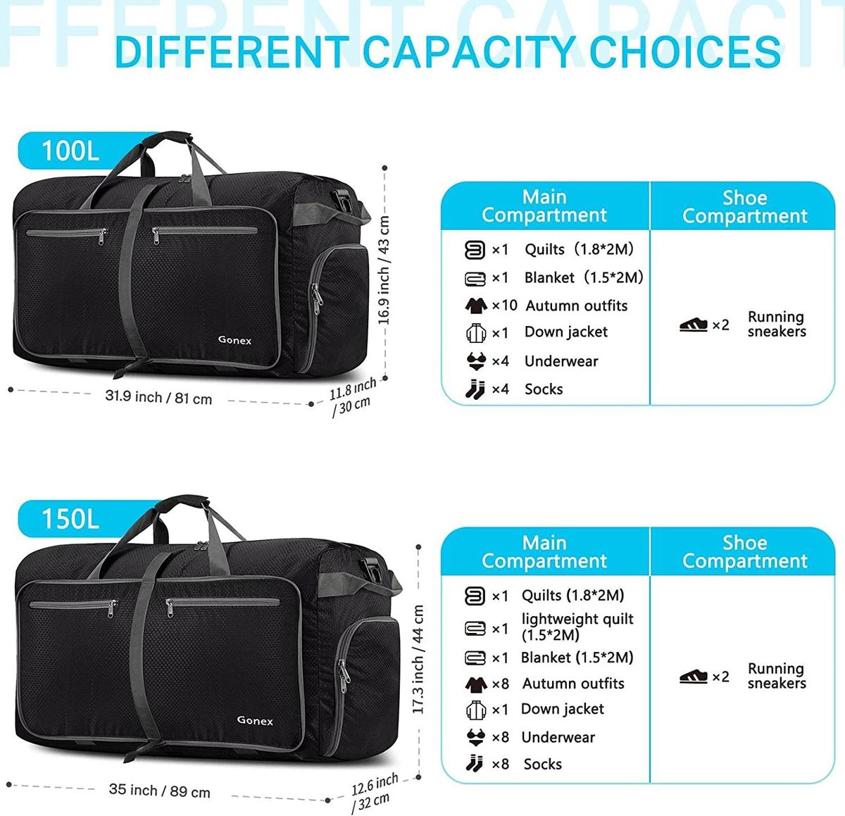 If you are about to plan to move, go to school or storage of winter clothes, then 150L huge capacity will be more suitable for you.