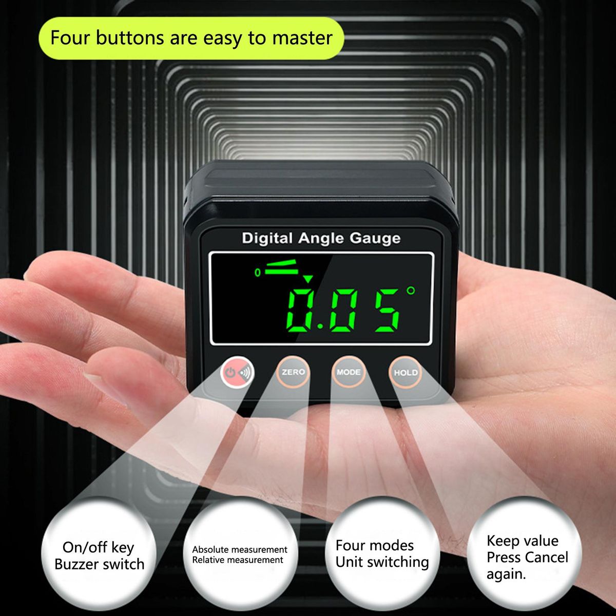 This angle protractor is suitable for woodworking, manufacturing, automobile repair and so on. It features set zero function at any angle, self checking accuracy, self calibration, etc.