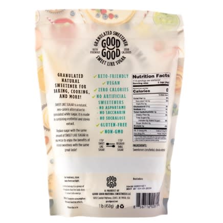 Pyure Organic Monk Fruit Sweetener provides the same taste, texture, and feel as traditional sugar without the added calories or carbohydrates. This sugar substitute is super sweet, so you only need a small amount. There's no bitterness or aftertaste, and it mixes and dissolves well.