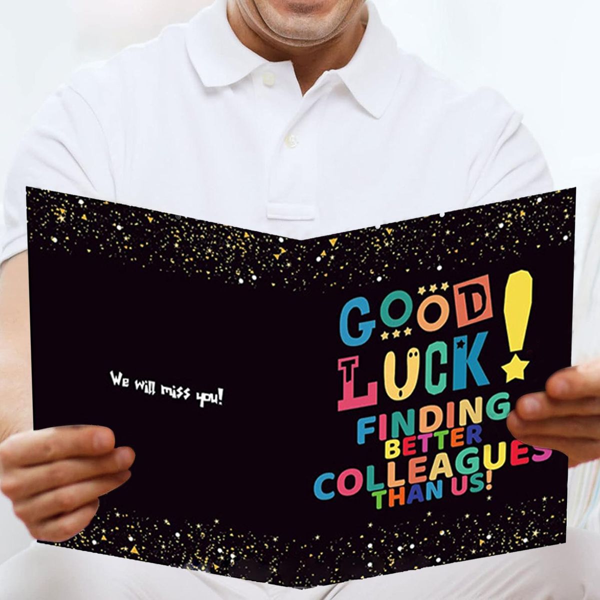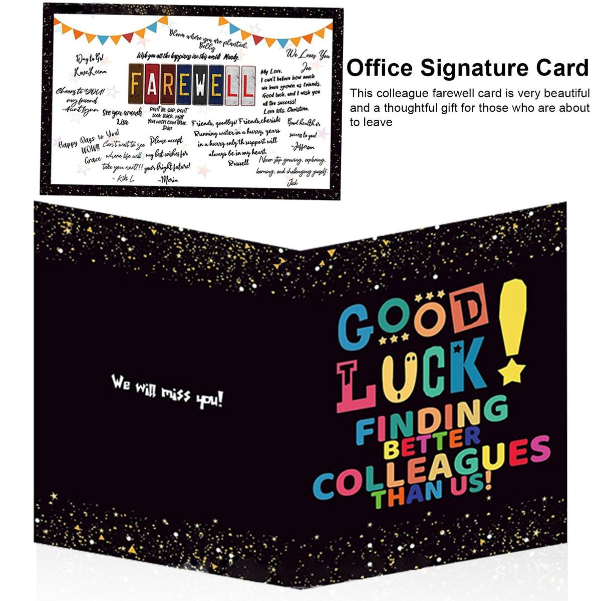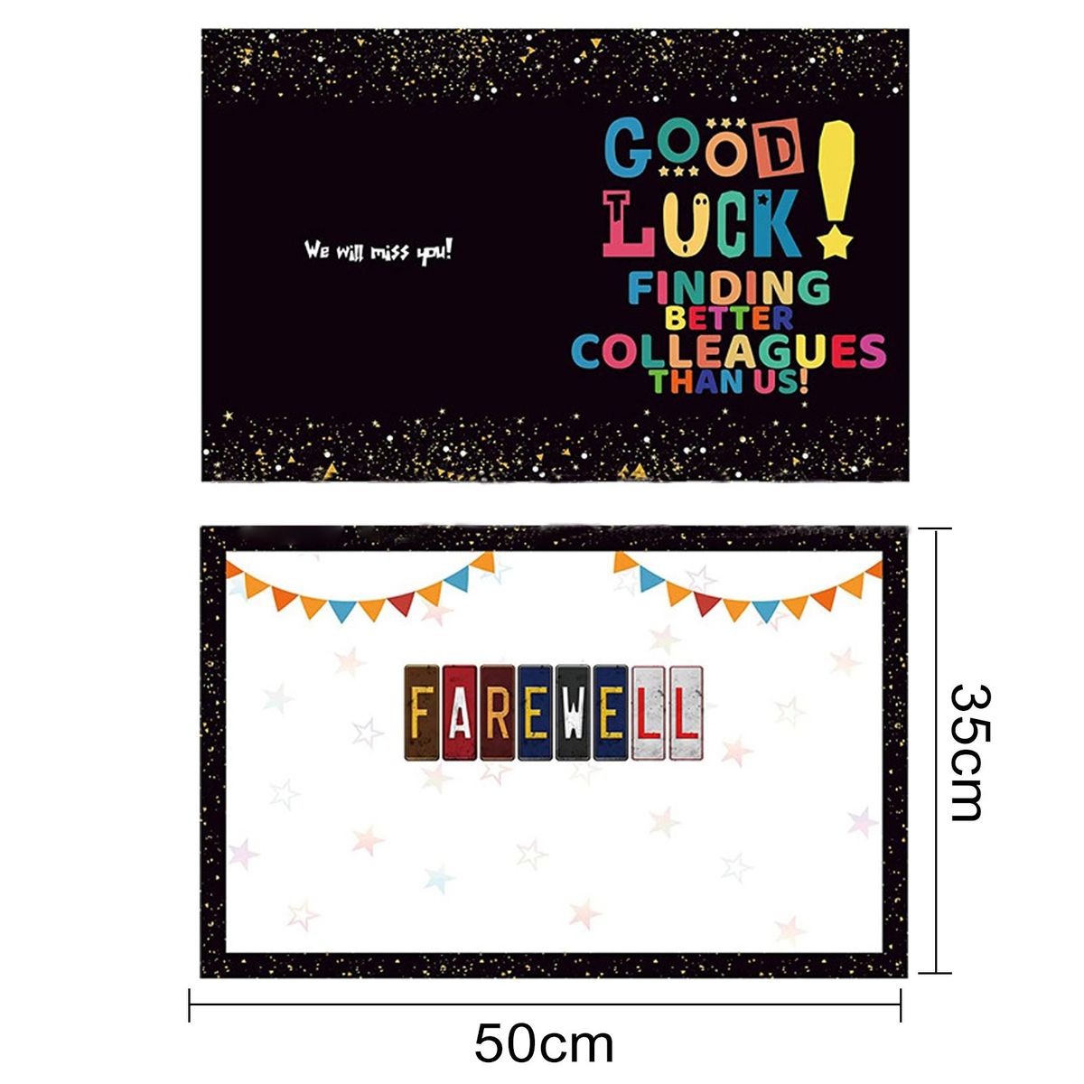 Featuring a colorful good luck, finding better colleagues than us design, this card is sure to bring a smile to their face. made from high-quality cardboard and laminated on the surface, it's durable enough to be used every day. and with a size of 35x50cm when unfolded and 35x25cm when folded, there's plenty of space inside for your wishes, fun thoughts, and even pictures.
