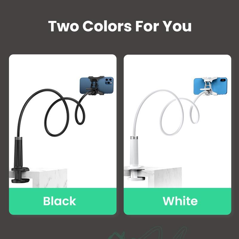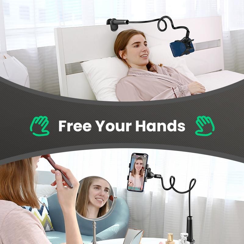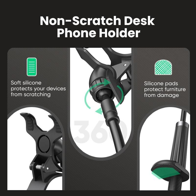 - The gooseneck phone holder with clamp can clipped to a desk for watching your phone handsfree, or overhead video recording.