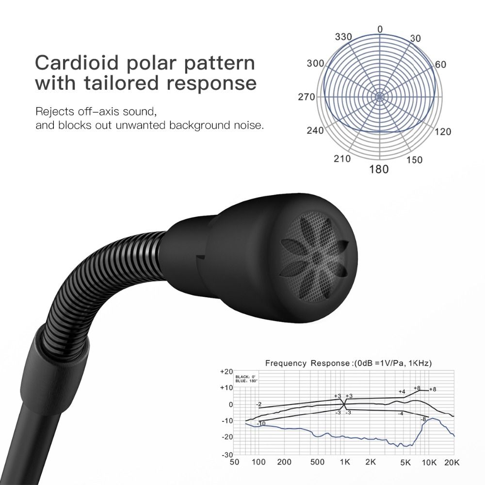 Plug and play USB microphone,connect it to your Mac or PC and you're on your way to recording,Skypeing and Discord. With a smooth and accurate response over a frequency range of 50Hz-20kHz,the pc microphone ideal for Live chat, IP communication,internet telecommunication.game chatting.