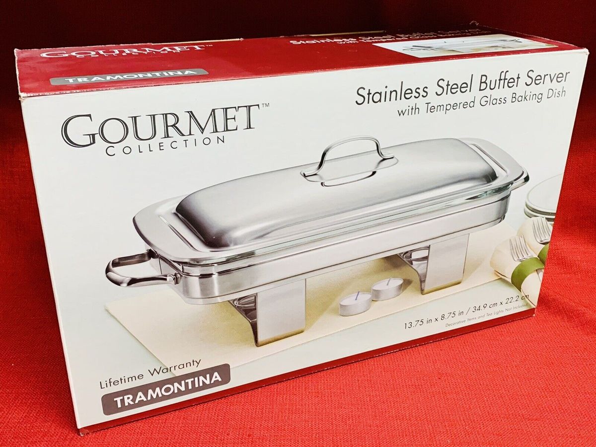 The Tramontina Gourmet Stainless Steel Buffet Server With Tempered Glass Baking Dish is a convenient and elegant way to serve large gatherings, events, buffets, hotel breakfast areas, brunches, catering, parties, wedding banquets and self-service restaurants, etc. The size of food pans is sufficient to make cooking propellant safety burners and side handle racks are safe too! It will be worthy of your purchasing!