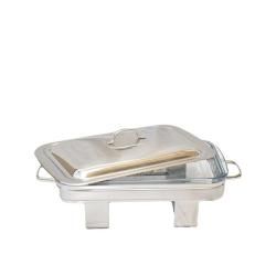 A durable stainless steel construction ensures this chafer is built to withstand everyday use while providing a timeless appearance that blends in with your classic decoration. It is designed to hold the lid in an upright position while food in the full-size chafer pan is being served. Also, the beveled legs provided optimum stability.