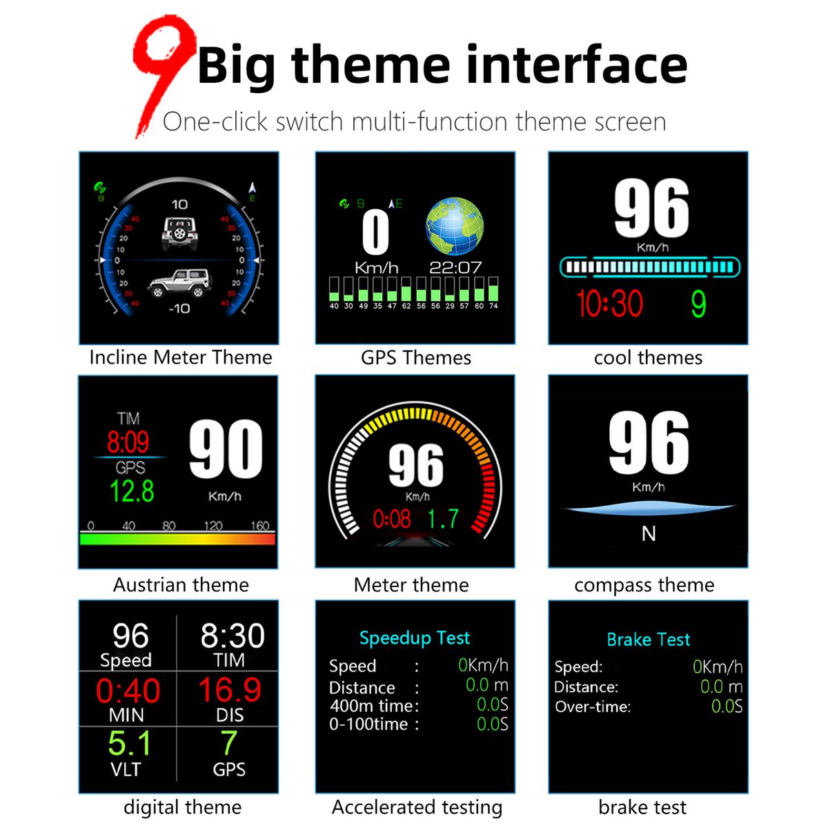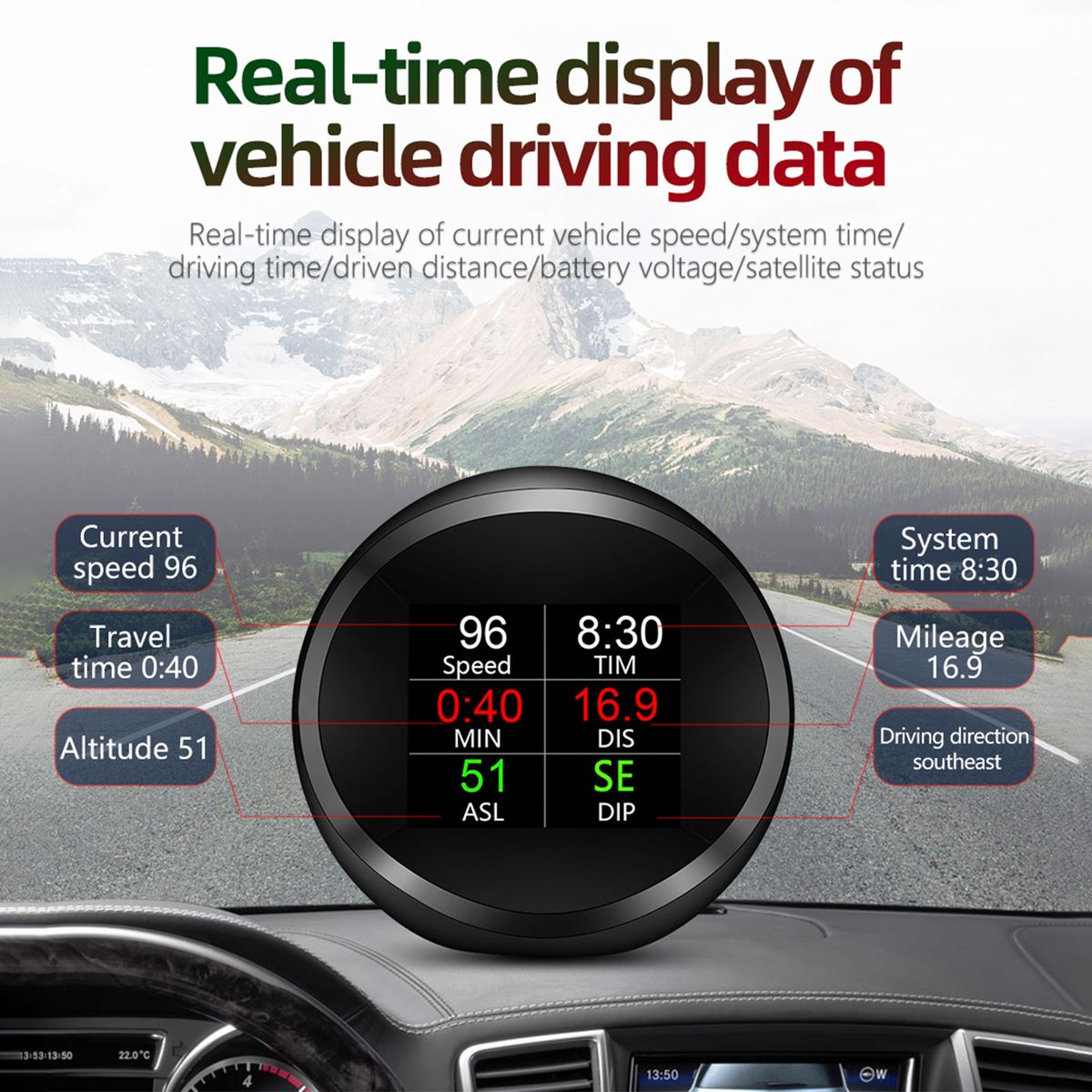 Real-time Display of Vehicle Driving Data: vehicle speed(Km/h or MPH), clock, altitude, single driving time, single mileage, driving direction, searching star number, acceleration test and brake test. Supports speeding alarm.