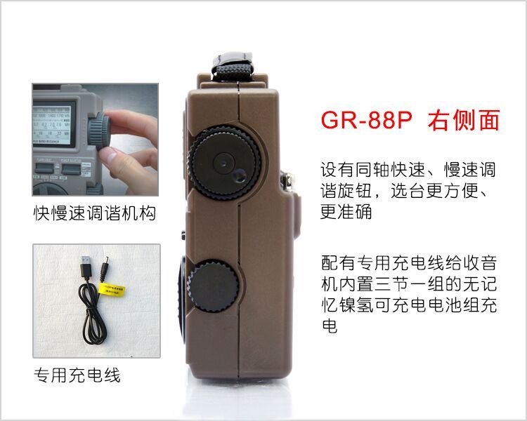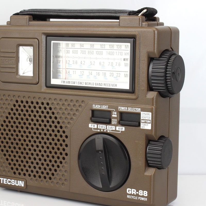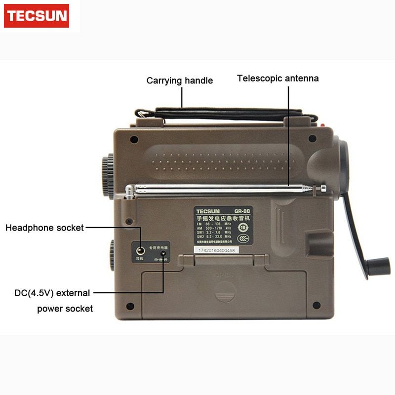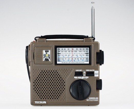 TECSUN GR-88 Digital Radio Receiver Emergency Light Radio Dynamo Radio With Built-In Speaker Manual Hand Power Generation Radio Tecsun GREEN-88 Dynamo Hand Cranking Radio FM\\AM\\SW band with Emergency Ligh ♦ Tecsun Green-88 radio built-in generator means that even in the most desperate situations, you can still have acce to local news and information as well as to news from around the world ♦ This radio features analog four-band (AM/FM/SW1/SW2) tuning with a concentric Fine Tune knob, and built-in LED flashlight ♦ The Green-88 is not only perfect for emergencies, but also for camping, hiking, traveling or just relaxing in the backyard ♦ Power supply mode: Built-in rechargeable 3.6v Ni-MH battery pack, 3 x AA size batteries (not included), Hand Crank recharge, AC adapter Product Features: 1.FM / MW / SW ( 1-2 ) 4 -band receiver system Proprietary tuning knob speed control 2.5 inch Speaker with excellent sound quality 3.Hand crank recharge 4.High Efficient Power generator for cranking charging 5.Built-in Emergency LED light 6.Earphone jack 7.DC adapter jack 8.Compact and portable Technical Parameters: 1.Frequency: -FM: 87~108MHz -AM: 525~1710kHz -SW1: 3.20~7.60MHz -SW2: 9.20~22.0MHz 2.Sensitivity: -FM is superior to 10μV -MW is superior to 1mV / m -SW is superior to 30μV 3.Dimensions: 16.8 x 14.8 x 5.4 cm 4.Weight: 511g without battery installed Using a dedicated charger : The first time you use the radio before , please use the supplied charger G-88C to the local built-in NiMH pack (600mAh) rechargeable would be G-88C charging switch to \" safe charging block \" charging time maintaining a continuous 16 hours or more. usually also ask you to use the \" safe charging block \" built-in for a long time to trickle charge , in order to ensure adequate electricity use in emergency situations , it is recommended that you use the built- hand way rechargeable batteries . 1.Before charging , place the radio 's power switch to \"off\" position . 2.8 hours charging block \" needs 8 hours charging time , charging is completed , please disconnect the power supply to avoid overcharging and damage the battery . 3.charging, do not be emergency lighting ( 6 ) opened, in order to avoid exceive current and damage the charger. Package Includes: 1 x Radio 1 x Built-in rechargeable Ni-MH battery 1 x AC Charger 1 x User manual
