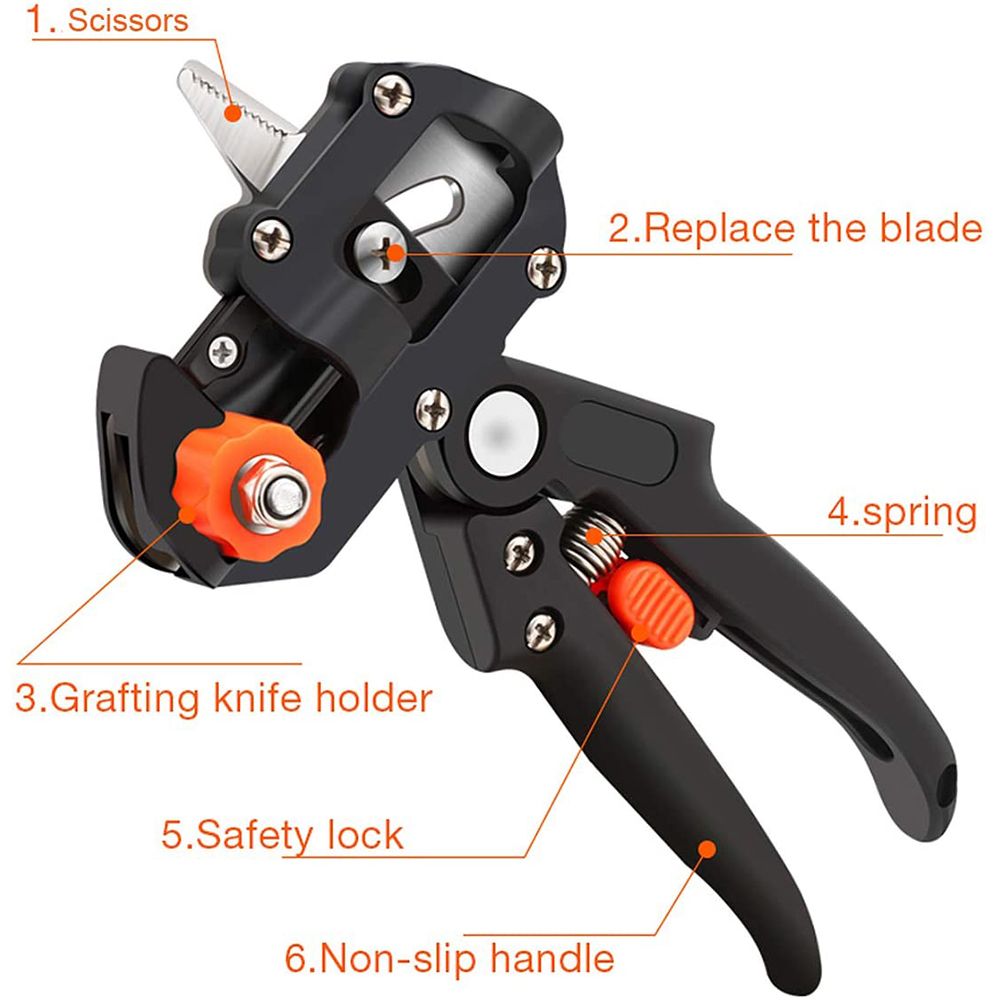 1.2-in-1 function, pruning and guillotine grafting blade, sciors can remove exce branches and leaves, and then use a special transplant guillotine to accurately cut the graft material.