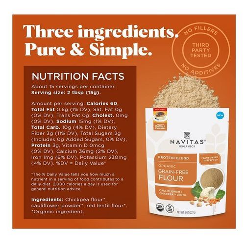 Navitas Organics Grain-Free Flour is a thoughtfully crafted flour blend to support grain-free and gluten-free diets. It's a healthful new option for your alternative baking needs! This is not your run-of-the-mill, regular flour. Finely milled from organic, whole cauliflower, chickpeas and red lentils, Navitas Organics Grain-Free Flour is a nutritious vegetable and legume flour blend that will help you boost the nutrition in your favorite gluten-free, alternative baking recipes. Containing only three minimally processed flours with no fillers or additives, it tastes like its plant-based ingredients—making it a great addition to heavily spiced or savory recipes including carrot cake, veggie burgers, crackers, savory crepes, and more. Our alternative flour is perfect for those looking to cut some grain flour out of their diets! 15 servings per bag. USDA organic, non-GMO, vegan, gluten-free, keto, paleo, and third party tested for quality assurance.