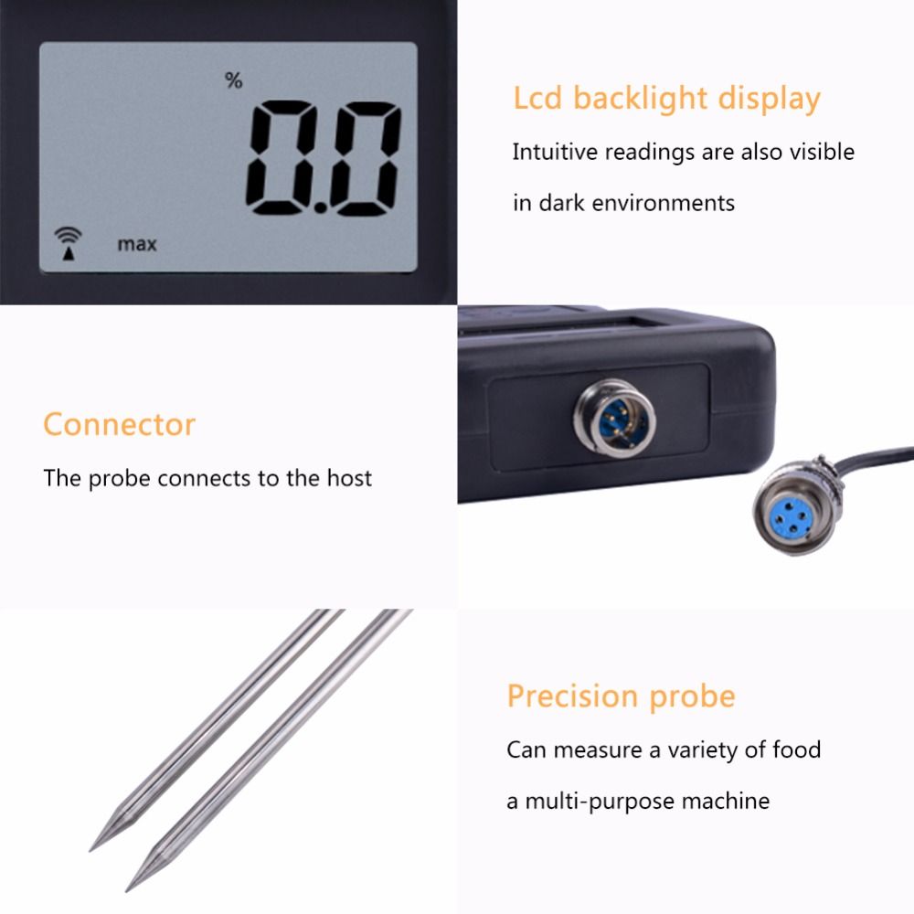 modname=ckeditor Multifunctional Grain Moisture Meter MS-G can testing packed grains included Barley, Corn,Hay, Oats, Rapeseed, Rough Rice, Sorghum, Soybeans and Wheat flour etc. The instrument is widely used in the proce of grain allotment, acquisition and storage. Features: 1. It is portable, compact, easy to use and the moisture measurement readings are instant. 2. Digital display with back light gives exact and clearly reading although you stay at the somber conditions. 3. It will save time and expense by monitoring dryne and helps to prevent deterioration & decay caused by moisture whilst in storage, therefore proceing will be more convenient and efficient. 4. Manual off at any time. Auto power off after 5 minutes from last operation. 5. Data hold function. Low battery alert. 6. Can testing 36 kinds of grains by different reference codes. Specification: Display: 4 digital LCD Measuring range: 5%-30% Measure Condition: Temperature:0-60 Humidity:5%-90% Resolusion: 0.1 Accuracy: ±0.5%n Operation: Electrical Resistance Method, Automatic temperature Compensation Power supply: 4x1.5 AAA size (UM-4) battery (Not Included) Dimensions: Main Unit: 140mm×60mm×22mm Needle: 280mm Weight: 215g (not including batteries) Guarantee: 1 year