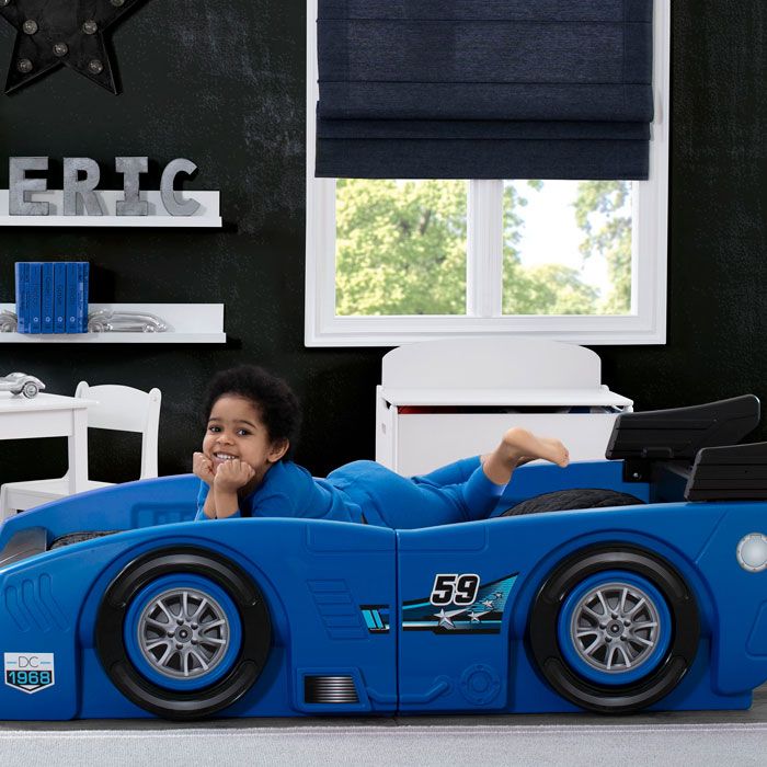Vroom, vroom! Your little racer will be on the road to a good night's sleep in no time with the Grand Prix Race Car Toddler-to-Twin Bed by Delta Children. This sleek bed resembles a racetrack-ready car with realistic details, like an aerodynamic spoiler, as well as 3D accents and decals that accentuate the headlights, wheels, and exhaust. Its grow-with-me design starts out as a toddler bed, then easily converts into a twin bed by inserting four included panels that extend the length and width of the bed. To ensure your child's safety the mattress sits low in the bed frame while the sides of the car act as secure guardrails. Take it for a spin today.