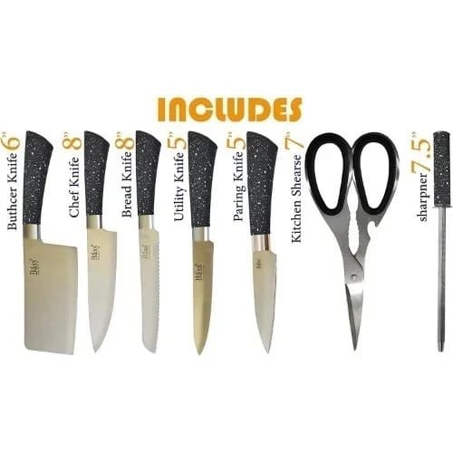 This 7-piece knife set will complement your cutting needs. Do everything needed to be done with a knife including Chopping vegetables, slicing turkey, boning fish, skinning oranges, and slicing hearty pieces of rustic bread with a different tool catered to each task. They feature molded plastic handles and stainless steel blades. The knives can always be neatly stored in the accompanying rack.