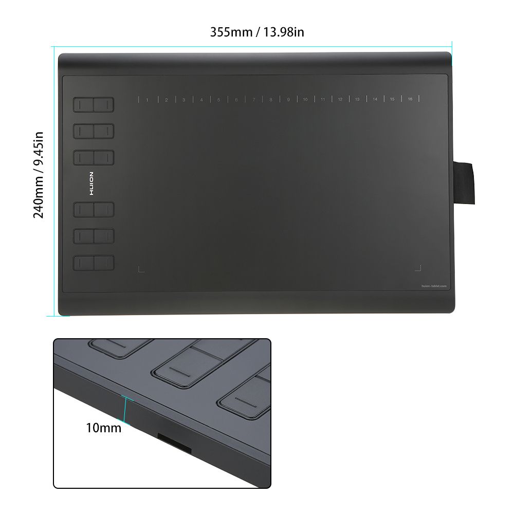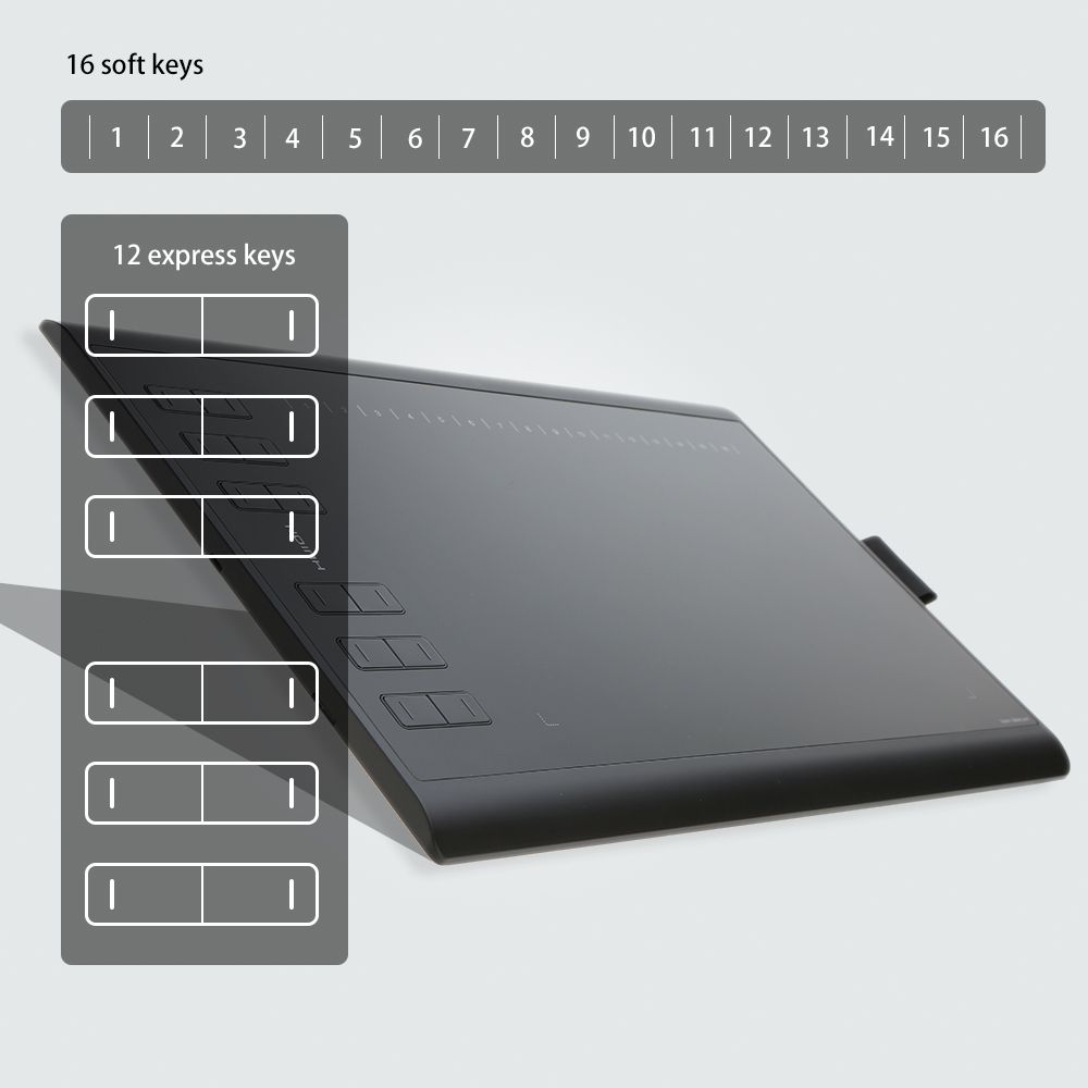 12 express keys on the left and 16 soft keys on the top of the drawing tablet's surface, all can be customized and provide you a plethora of ways to tailor your software experience and raise your work's efficiency.