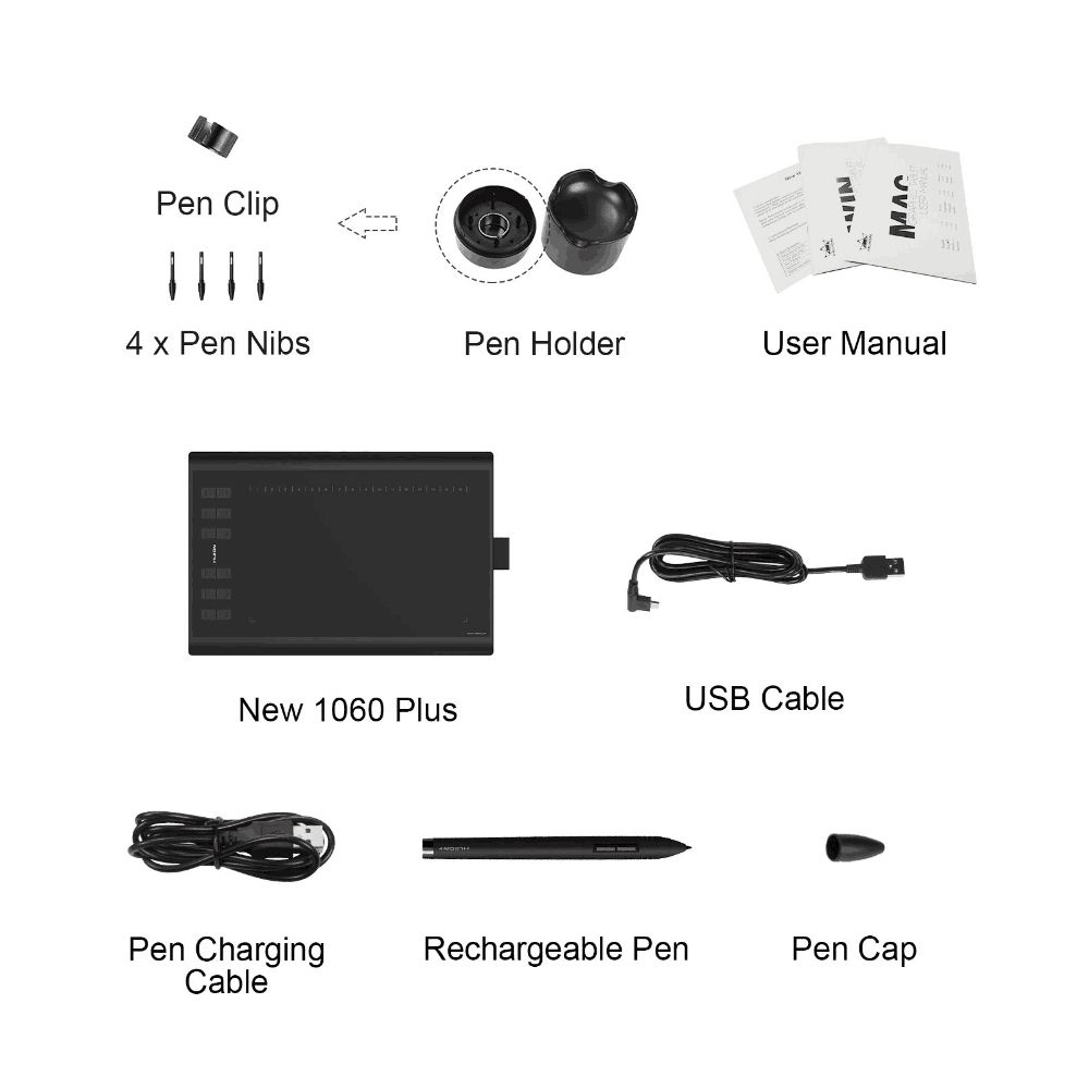 1 * 1060PLUS Pen Tablet(Micro SD Card is not included) ,1 * Rechargeable Pen,1 * Pen Holder(Including 4 * Pen tips and 1 * Tip clip) ,1 * Cable for Pen,1 * USB Cable,1 * Multinational Language User Manual