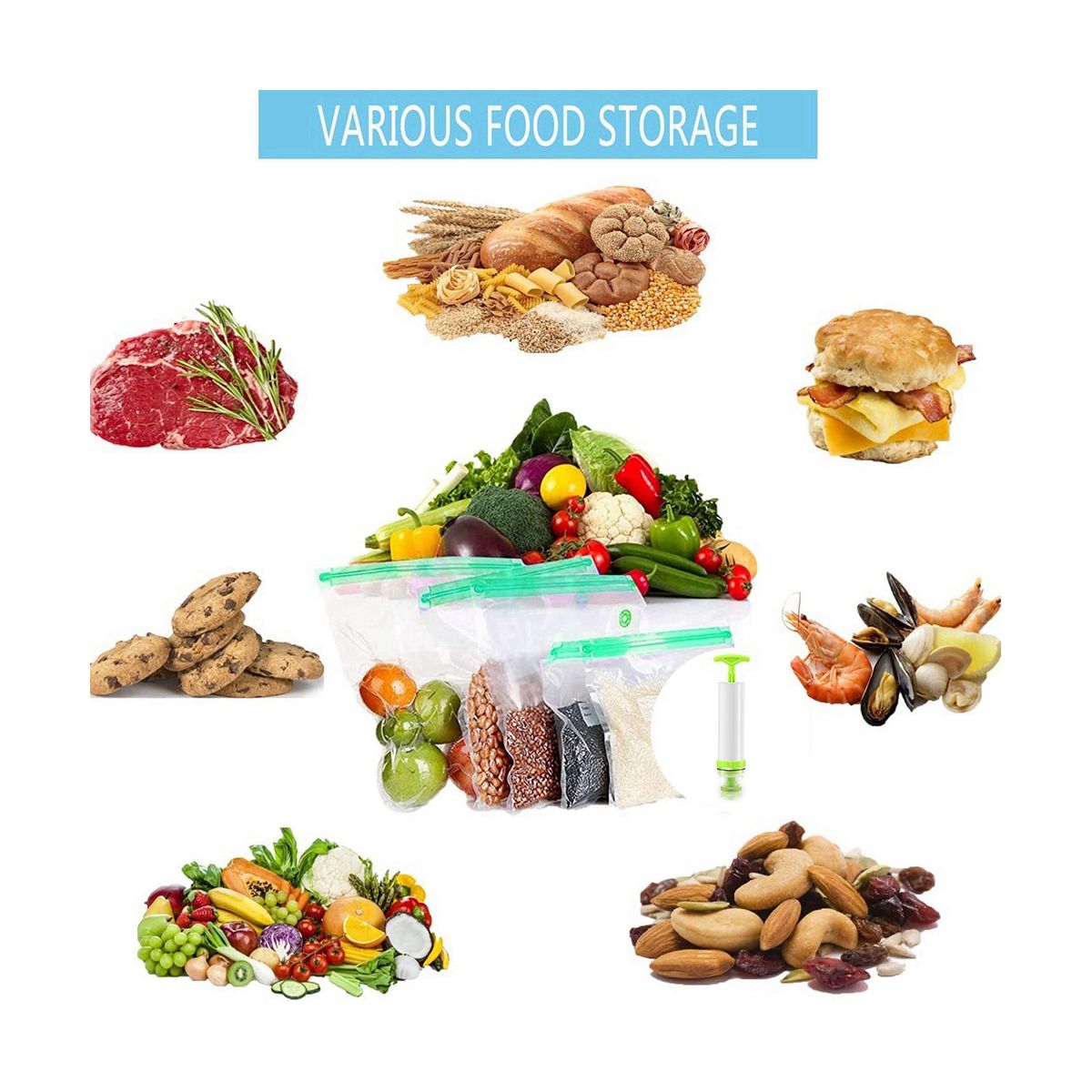 Bags:Comes with small/medium/ sizes(21x22cm,26x28cm,26x34cm), 1 hand pump and 4 sealing clips. perfect reusable vacuum food storage bags for storing different food.