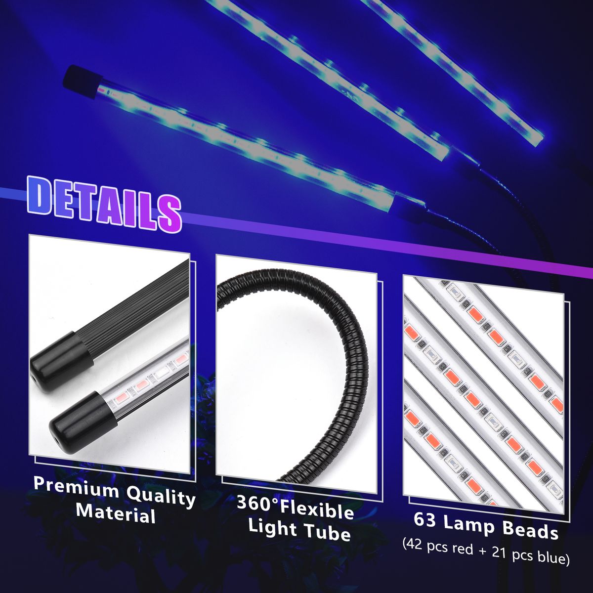 Upgraded Grow Light: 63 lamp chips in total, with 42 red lights and 21 blue lights. Red wavelength is at 620-660nm and the blue wavelength is 430-470nm.