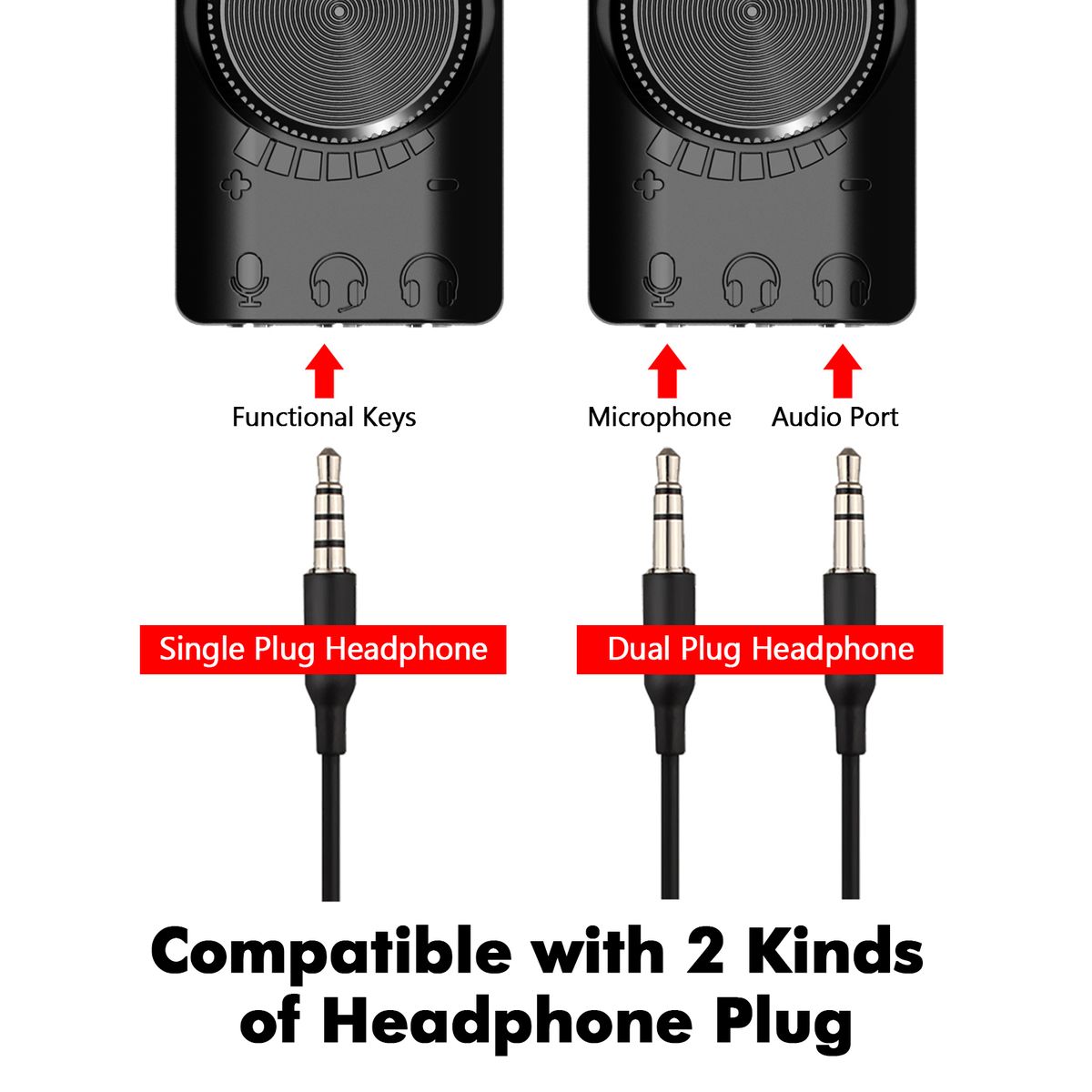 【Sound Card Structure】 Interfaces includes USB, 3.5mm single jack (4-pin) and 3.5mm double jack (3-pin) - headphone jack and microphone input jack.