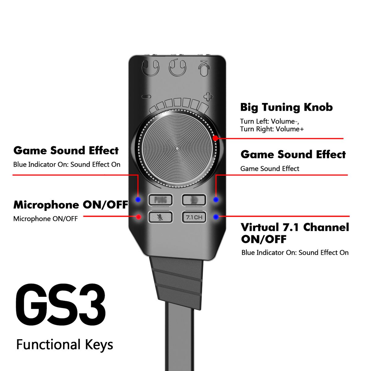 Functional Keys: Functional keys includes microphone-mute, 7.1 Channel ON/OFF and volume-up/down roller, sound effect buttons for 2 popular games, easy to use.